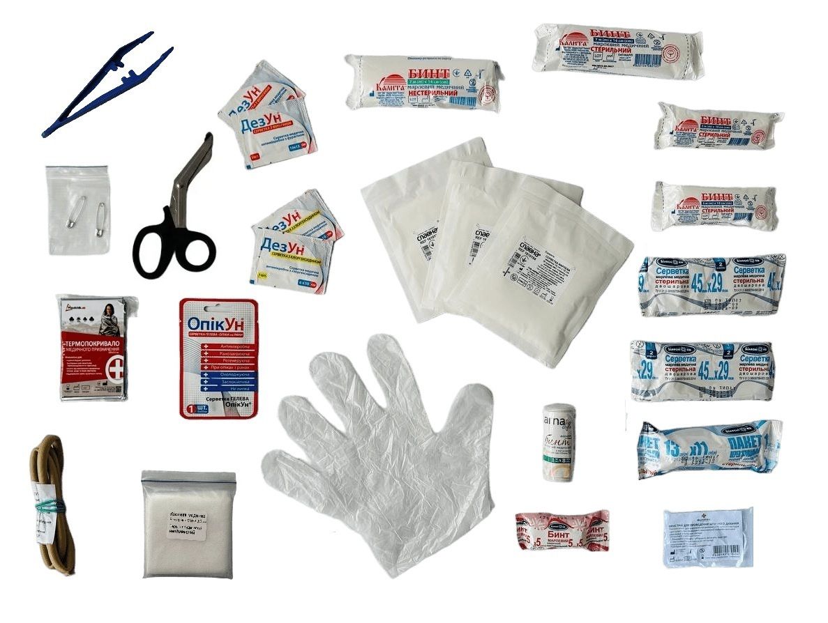 Це набір виробів медичного призначення, оснащений антисептичними, дезінфікуючими, протиопіковими, реанімаційними, фіксуючими та іншими допоміжними засобами для своєчасного надання першої домедичної допомоги постраждалому при травмах, переломах, вивихах, втраті свідомості.