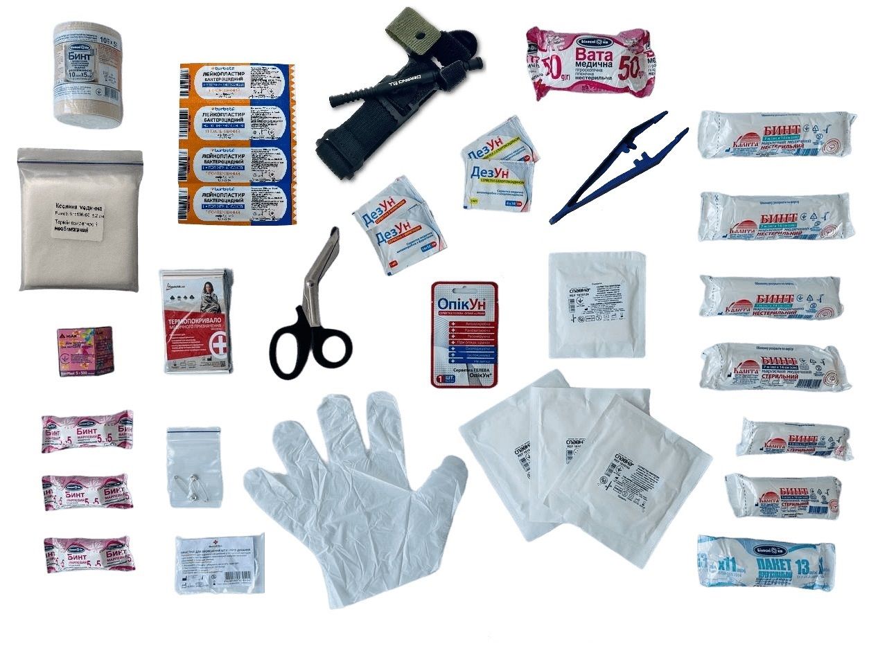 Комплектація аптечки відповідає ДСТУ 3961-2000 та включає всі необхідні засоби для обробки ран, зупинки кровотеч, фіксації кінцівок, надання допомоги при опіках, травмах та інших екстрених ситуаціях.