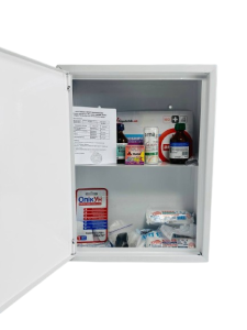 Аптечка містить вироби для обробки та перев'язки ран, антисептичні, дезінфекційні, протиопікові засоби, які стануть в нагоді при різного роду незначних травмуваннях Металевий кейс для медикаментів можна розмістити в зручному доступному місці прикріпивши до стіни в цеху, на виробництві, на складі. Довідник з надання першої допомоги та рекомендації щодо застосування вкладень допоможуть вам швидко та ефективно використати медичний виріб ( засіб) за призначенням. В залежності від напрямку діяльності виробництва та видів травмувань - рекомендується доукомплектовувати додатковими засобами першої допомоги.