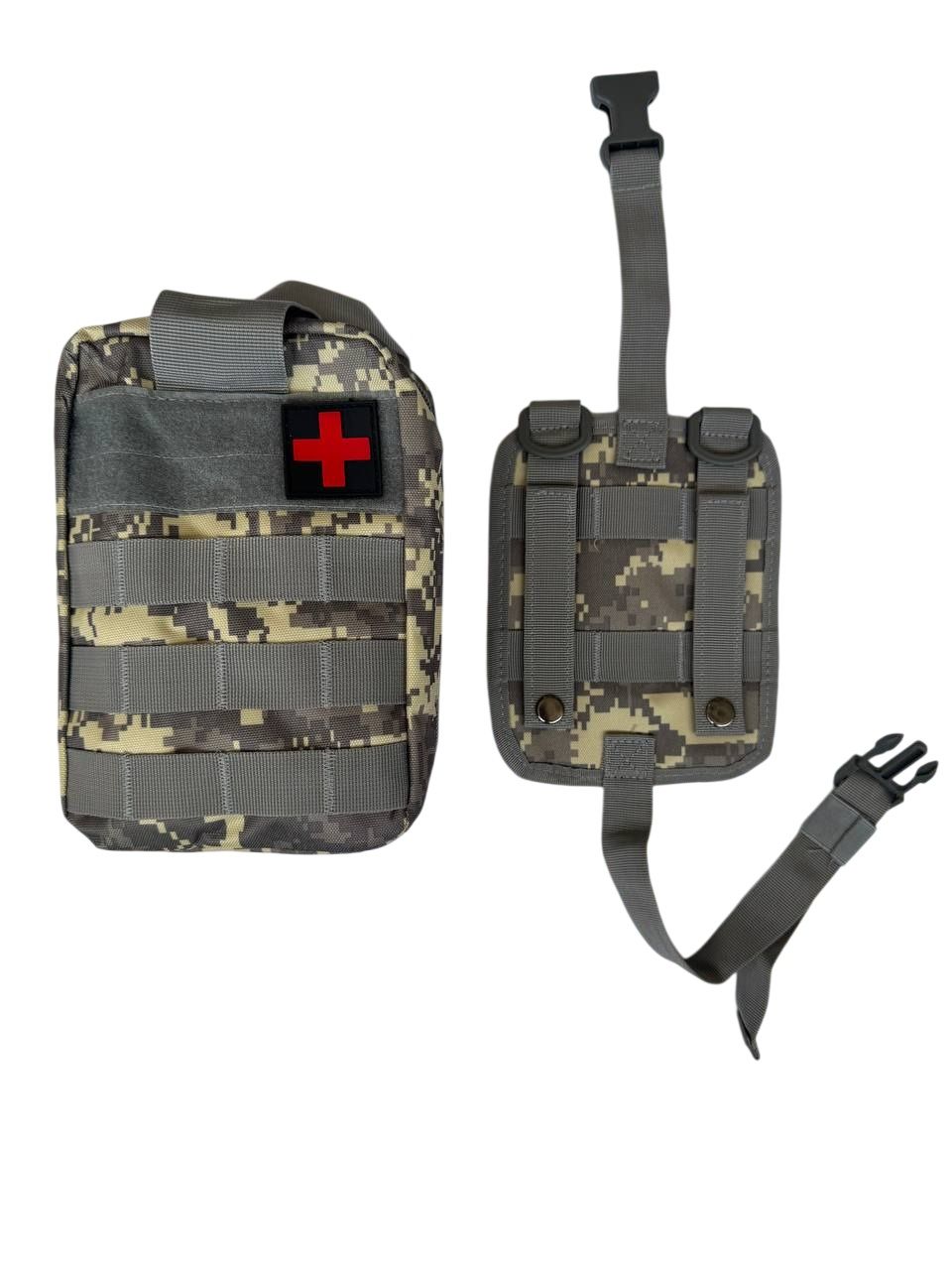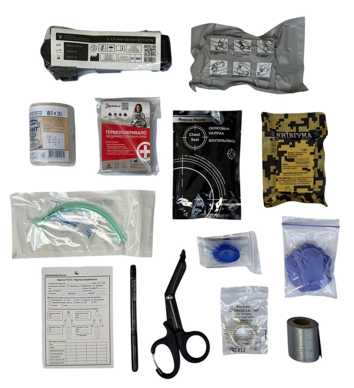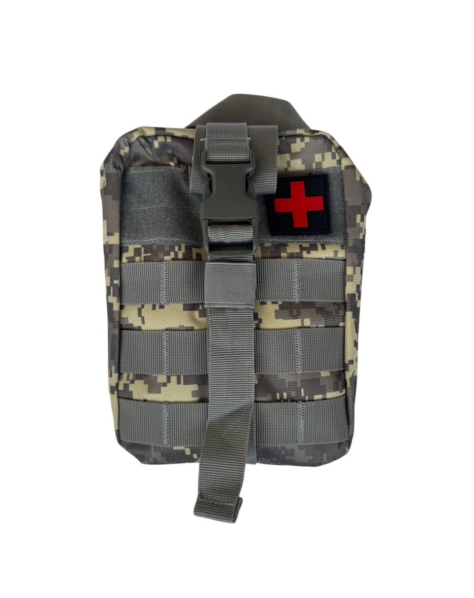 Тактична індивідуальна аптечка призначена для надання невідкладної першої допомоги в екстремальних умовах, зокрема в зоні бойових дій або при надзвичайних ситуаціях. Укомплектована відповідно до сучасних стандартів тактичної медицини. Містить кровоспинні, перев'язувальні, дихальні засоби, а також додаткові інструменти для підвищення ефективності першої допомоги. Зручний підсумок з системою Molle забезпечує надійне кріплення на екіпіровці.
