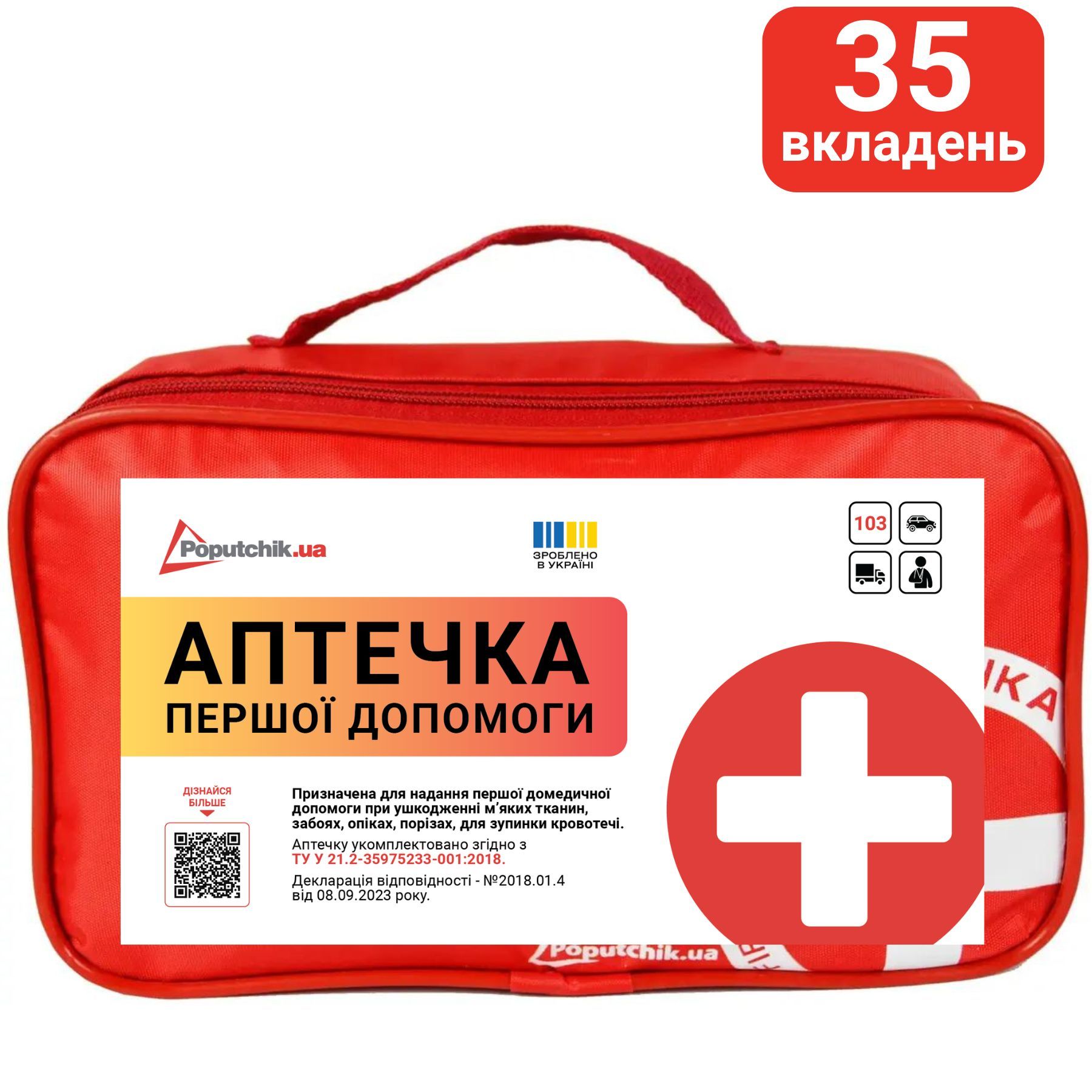 Аптечка для першої допомоги згідно ТУ У 21.2-35975233-001:2018  призначена для надання першої медичної допомоги, у побуті, в подорожах, в автомобілі, в офісі. Аптечка дуже легка та компактна, тож ви можете зручно розмістити її як у Вашому багажі, так і у звичайній сумці. Містить антисептичні засоби та перев'язувальні матеріали, пристрій для серцево- легеневої реанімації та інші засоби які стануть в нагоді при порізах, опіках, саднах, розтягненнях м 'яких тканин. .Довідник з надання першої допомоги та рекомендації щодо застосування вкладень допоможуть вам швидко та ефективно використати  медичний виріб ( засіб) за призначенням. В залежності від хронічних захворювань, вікової категорії майбутнього власника,  типу  подорожі - рекомендується доукомплектовувати  додатковими лікарськими  засобами .