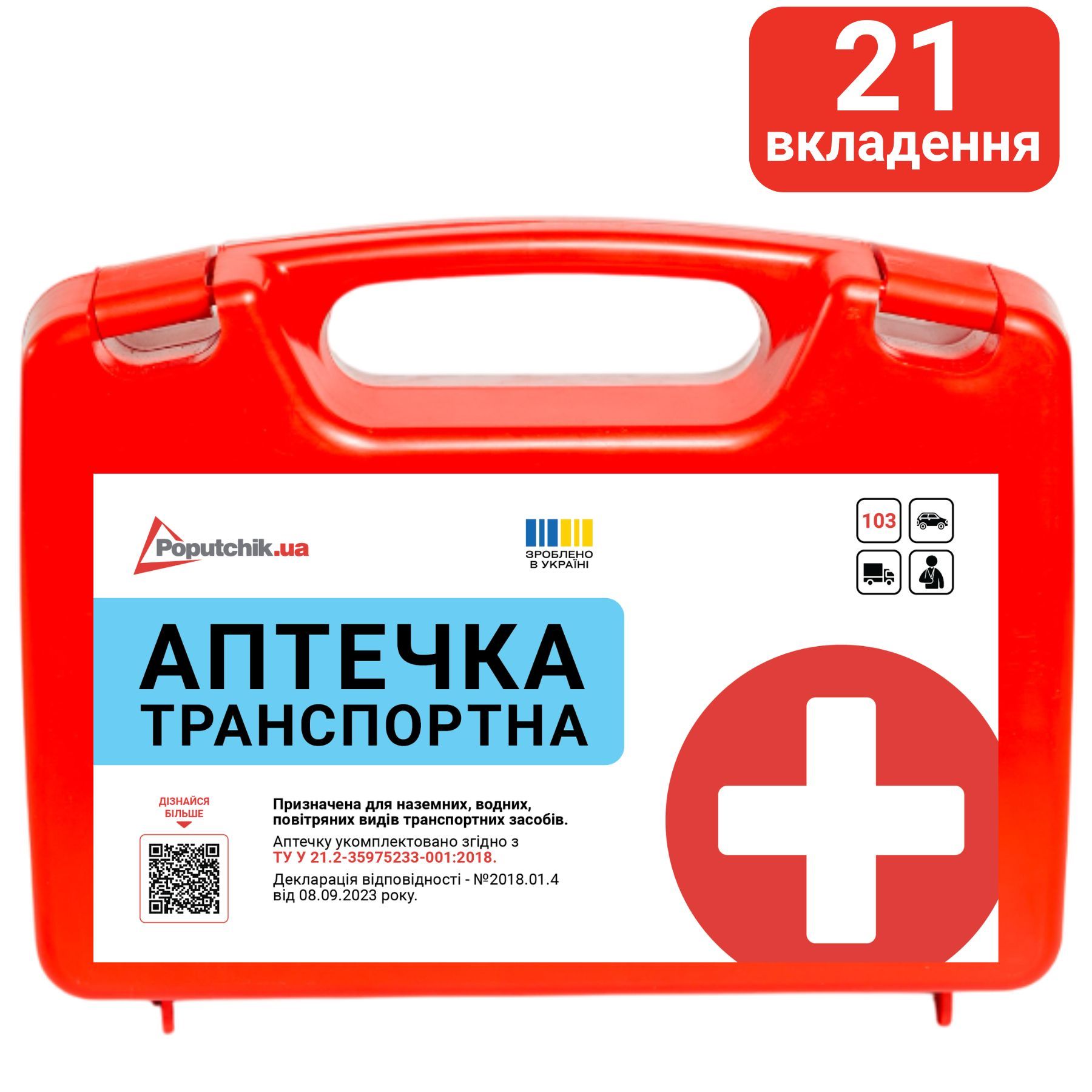 Аптечка медична транспортна згідно ТУ У 21.2-35975233-001:2018 призначена для надання першої медичної допомоги у легкових та вантажних автомобілях з кількістю до 9 осіб. Використовується при порізах, подряпинах, забоях, зупинці кровотечі, надання допомоги штучного дихання.