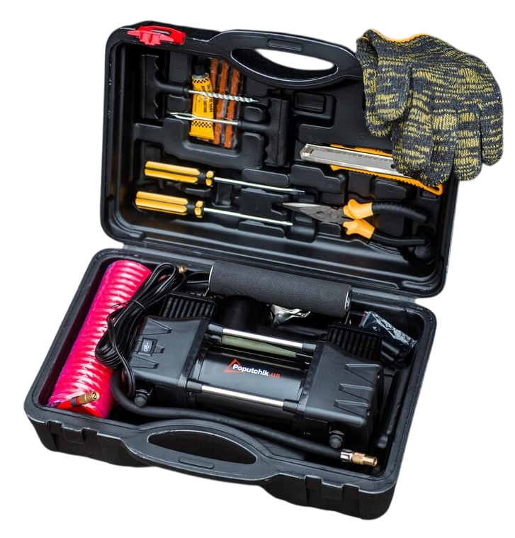 Автокомпресор 85л/хв + Набір ремкомплекту для шин в кейсі Poputchik