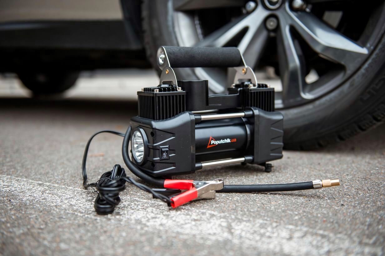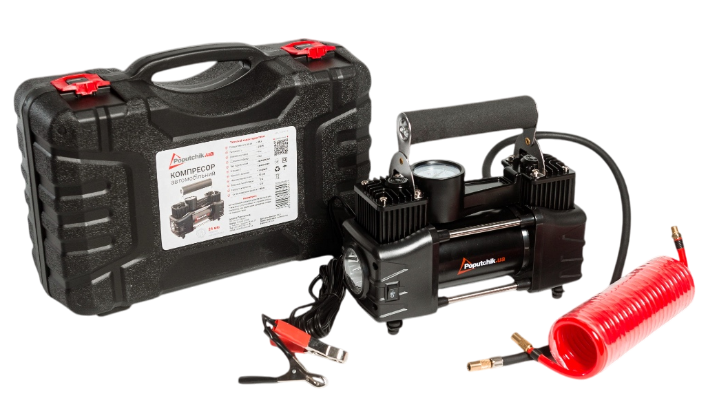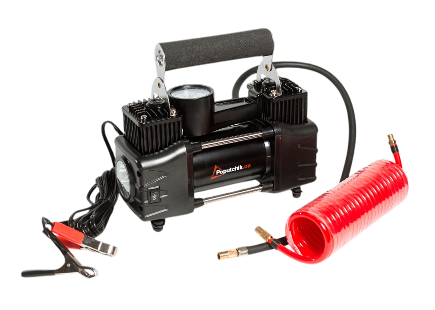 Автомобільний компресор Poputchik з двома поршнями призначений для легкових автомобілів, кросоверів, позашляховиків та вантажівок з розміром коліс R 13 - 23, потужний та ефективний пристрій для швидкої підкачки шин. З продуктивністю 85 л/хв і потужністю 350 Вт, він забезпечує максимальний тиск до 10 АТМ. Це ідеальний варіант для довготривалого використання завдяки часу безперервної роботи до 30 хв. Компресор підключається через акумуляторны клеми, має аналоговий манометр для точного контролю тиску. У комплекті є не лише сам компресор, а й корисні інструменти для ремонту шин, що робить його незамінним помічником на дорозі.