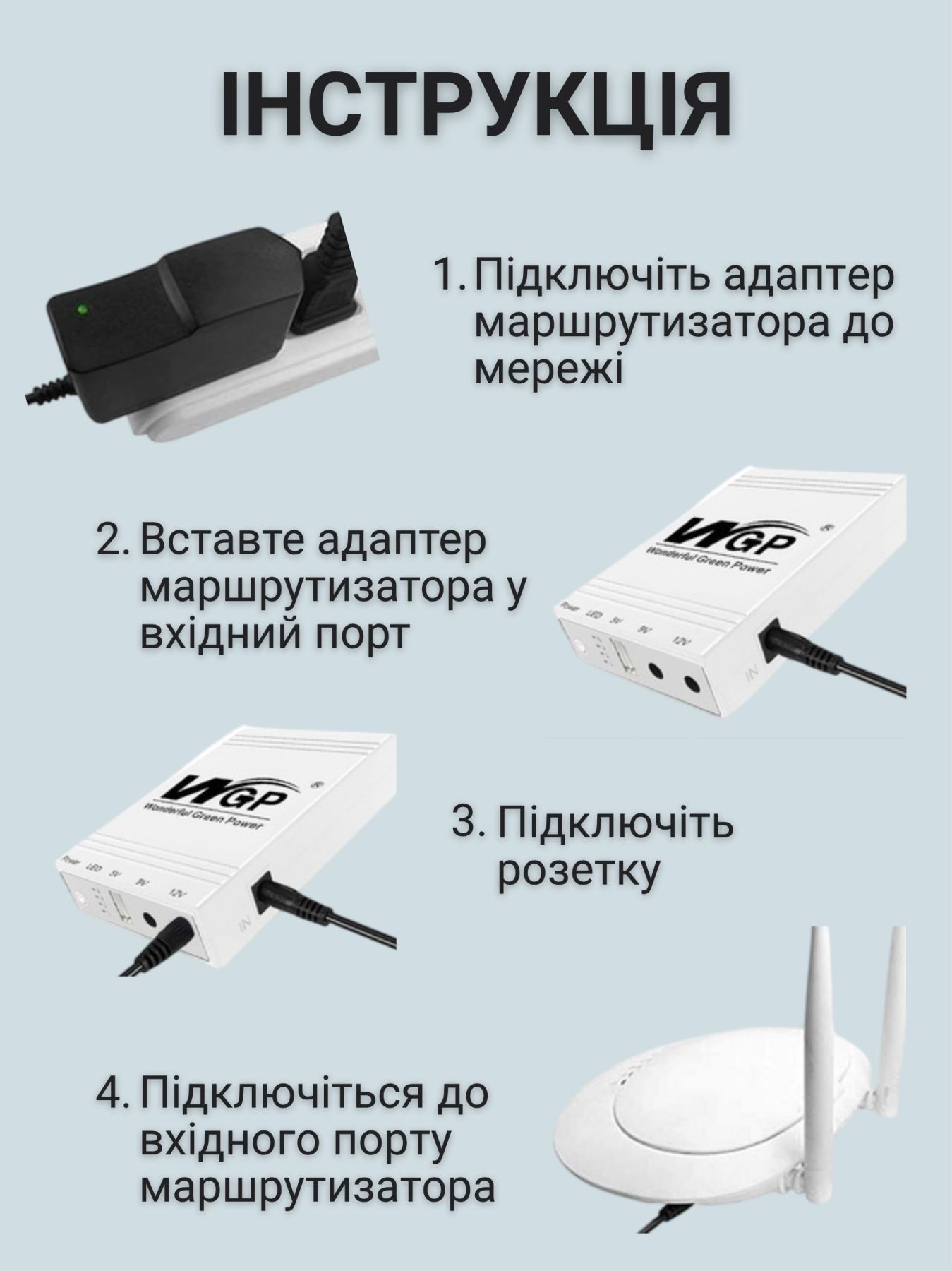 Універсальний резервний акумулятор Powerbank WGP103 призначений для забезпечення безперебійної роботи інтернет-обладнання — роутерів, модемів тощо. Завдяки ємності 10400 мАг (4 елементи 18650 по 2600 мАг) пристрій здатен підтримувати живлення від 6 до 10 годин залежно від споживання енергії. Ідеальне рішення для будинку, офісу або під час відключення електроенергії.