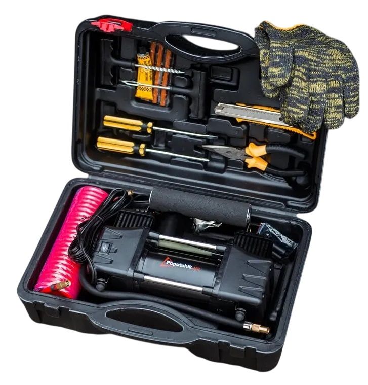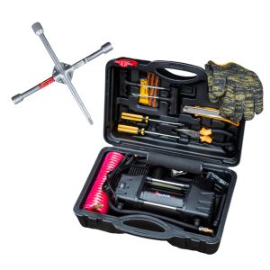 Комплект включає все необхідне для швидкої накачки шин та проведення дрібного ремонту: від ремкомплекту для шин до інструментів (викруток, плоскогубців, ножа, рукавичок) та посиленого ключа для коліс. Усе це упаковано в зручний кейс, що дозволяє завжди мати набір під рукою.