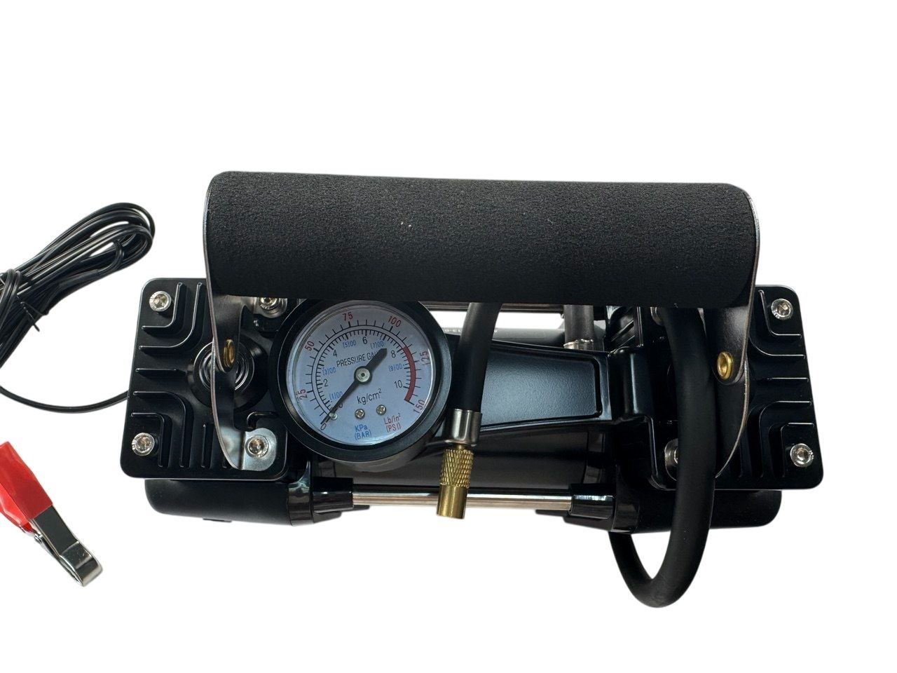 Потужний автомобільний компресор з двома поршнями, 85 л/хв, 12V, 350 Вт -  ідеальне рішення для накачування шин, матраців, м’ячів, надувних човнів та іншого спорядження. Завдяки потужному електродвигуну з мідною обмоткою та металевому поршню з шатуном і підшипниковою парою, компресор забезпечує стабільну продуктивність до 85 л/хв при максимальному тиску до 10 АТМ. Компресор працює від 12V з підключенням через акумуляторні клеми, має аналоговий манометр для точного контролю тиску та вбудований ліхтар для зручності у темну пору доби.