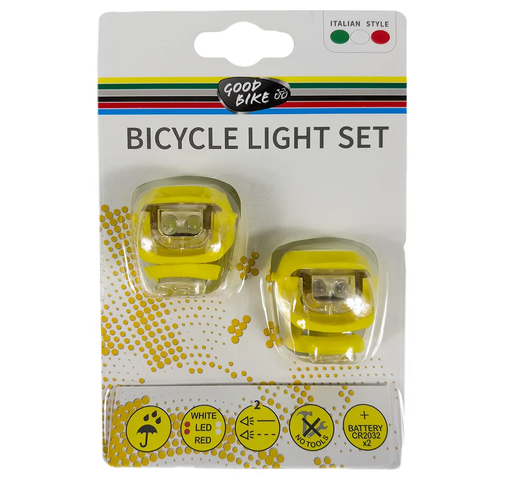 Комплект з двох ліхтарів блимавок (передні та задні) у силіконовому корпусі. Призначені для позначення велосипедиста на дорозі чи для додаткового/резервного освітлення в темний час доби.