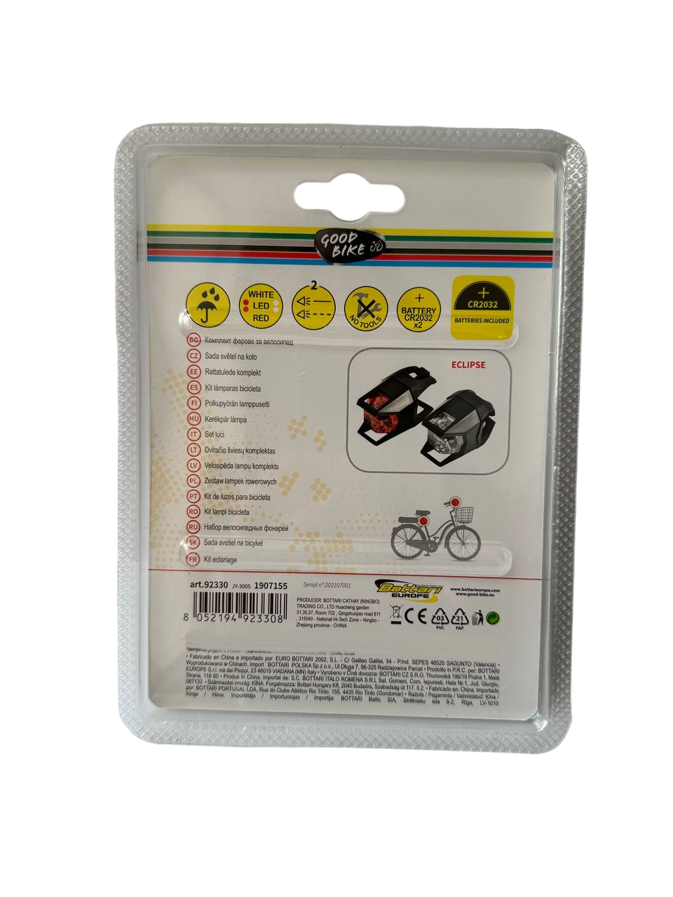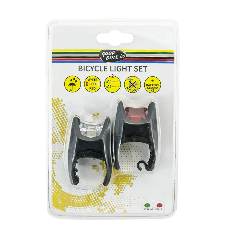 Комплект велосипедних ліхтарів переднє та заднє світло у пластиковому водозахисному корпусі з простим кріпленням.