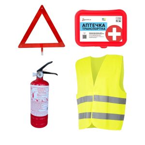 Набір автомобільний для безпеки на дорозі містить такі необхідні елементи, як аптечка, знак аварійної зупинки, вогнегасник та жилет сигнальний.