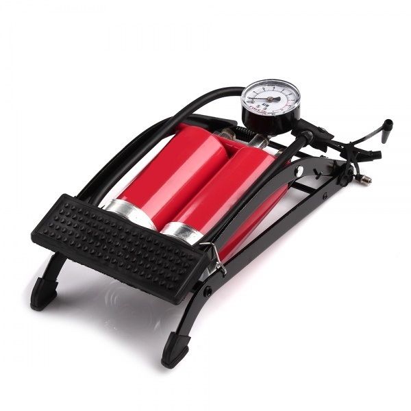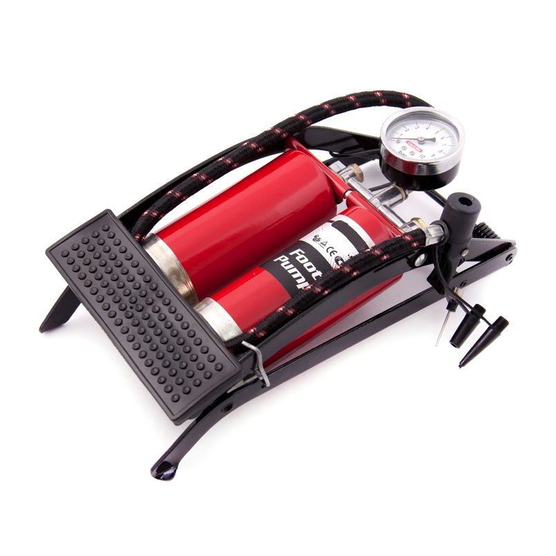 Ножний насос з двома циліндрами — це необхідний інструмент для швидкого та ефективного накачування автомобільних та велосипедних шин, гумових виробів або спортивного інвентарю, такого як футбольні м'ячі. Оснащений манометром для точного контролю тиску і додатковими адаптерами для універсального використання.