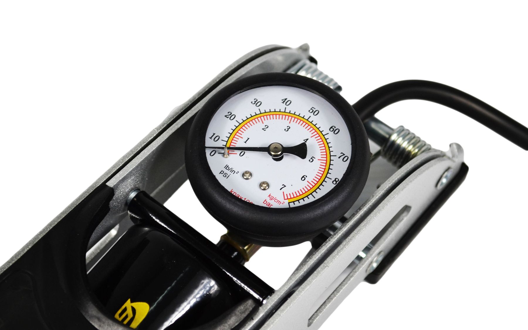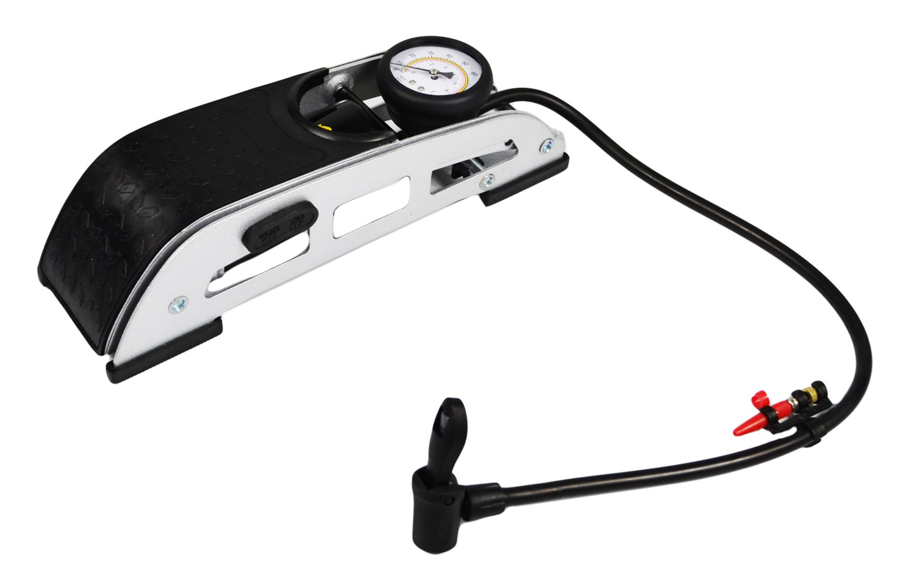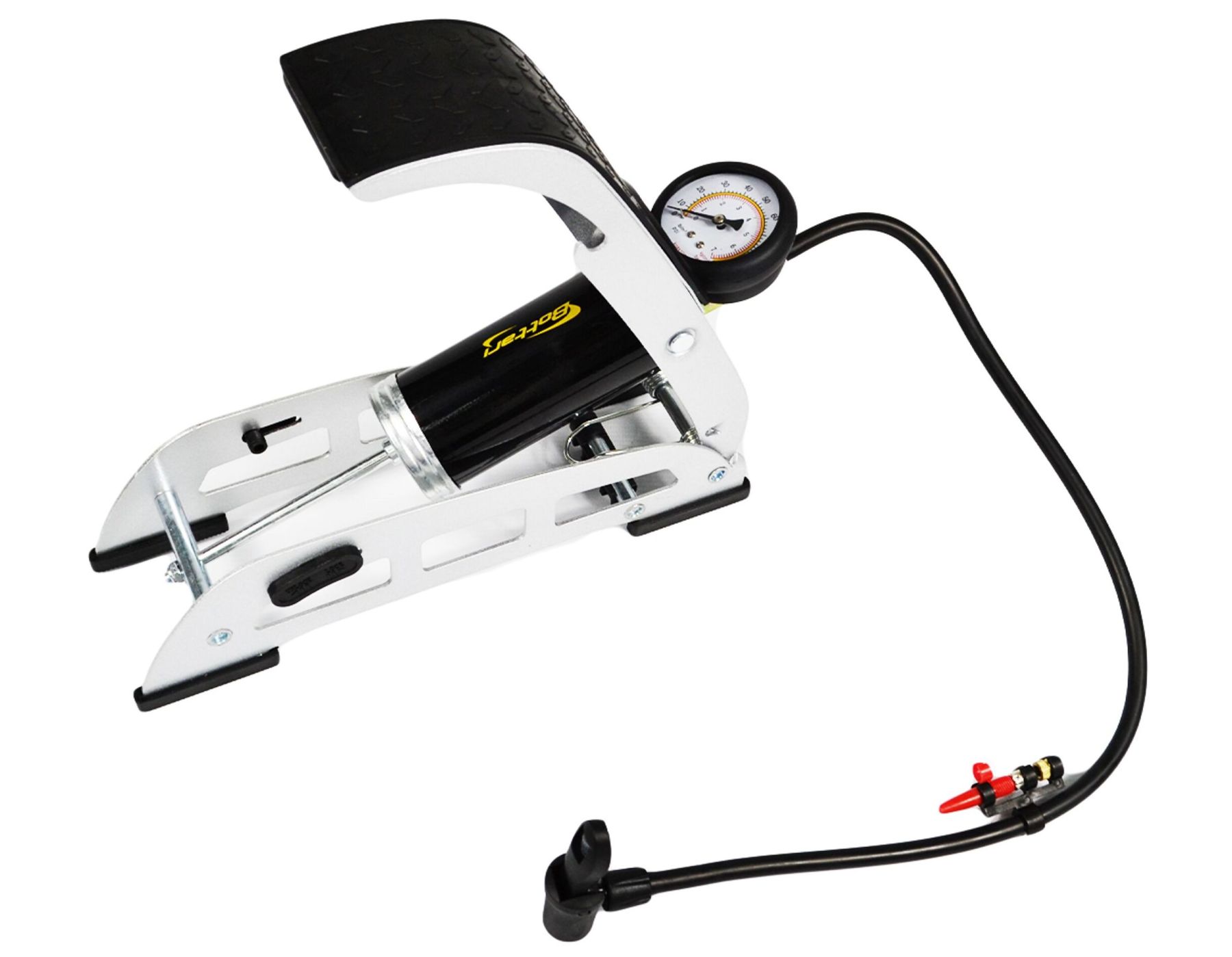 Насос ножний з манометром однопоршневий, конструкція якого відрізняється високою міцністю.