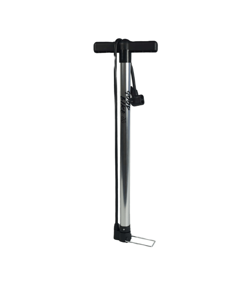 Ручний універсальний насос якісного алюмінієвого корпусу, зі штоком всередині, та опорную ніжкою, що складається для зручності транспортування.