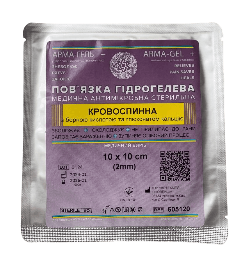 Пов'язка гідрогелева кровоспинна з борною кислотою та глюконатом кальцію «АРМА-ГЕЛЬ+», 10 х 10 см