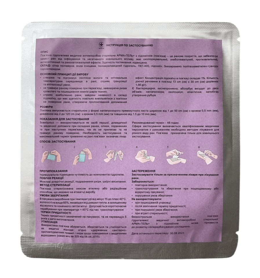 Гідрогельова стерильна медична пов'язка «Арма-Гель+» з лідокаїном призначена для надання першої невідкладної допомоги при опіках, різноманітних поверхневих пошкодженнях без рясної кровотечі та для лікування ран післяопераційних, трофічних виразок, пролежнів, запальних процесів і захворювань шкіри.