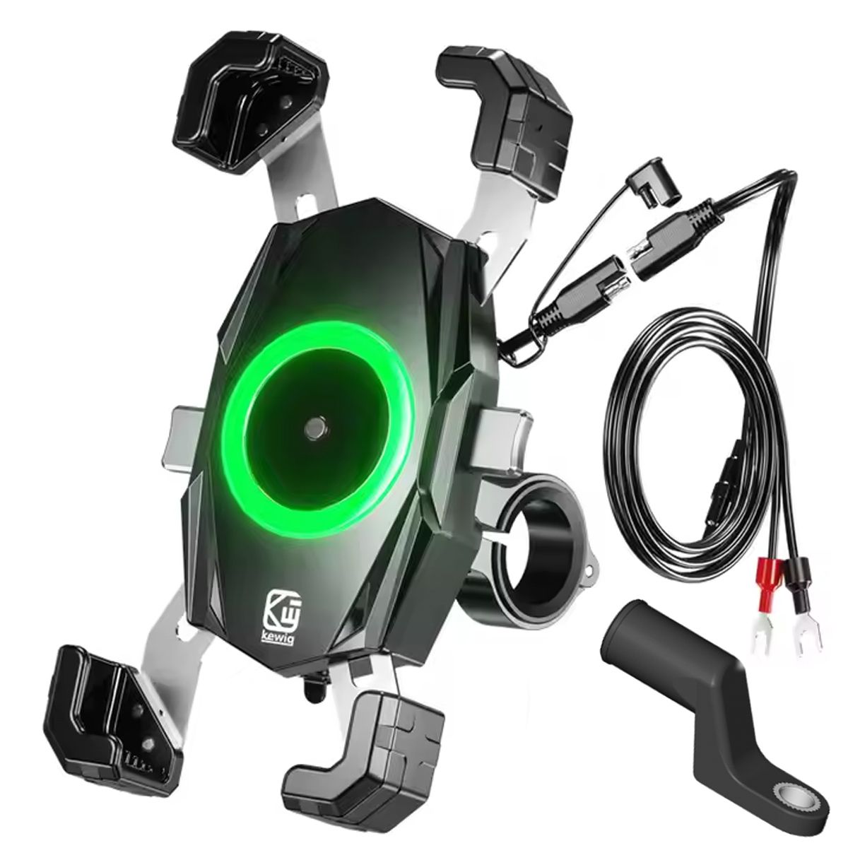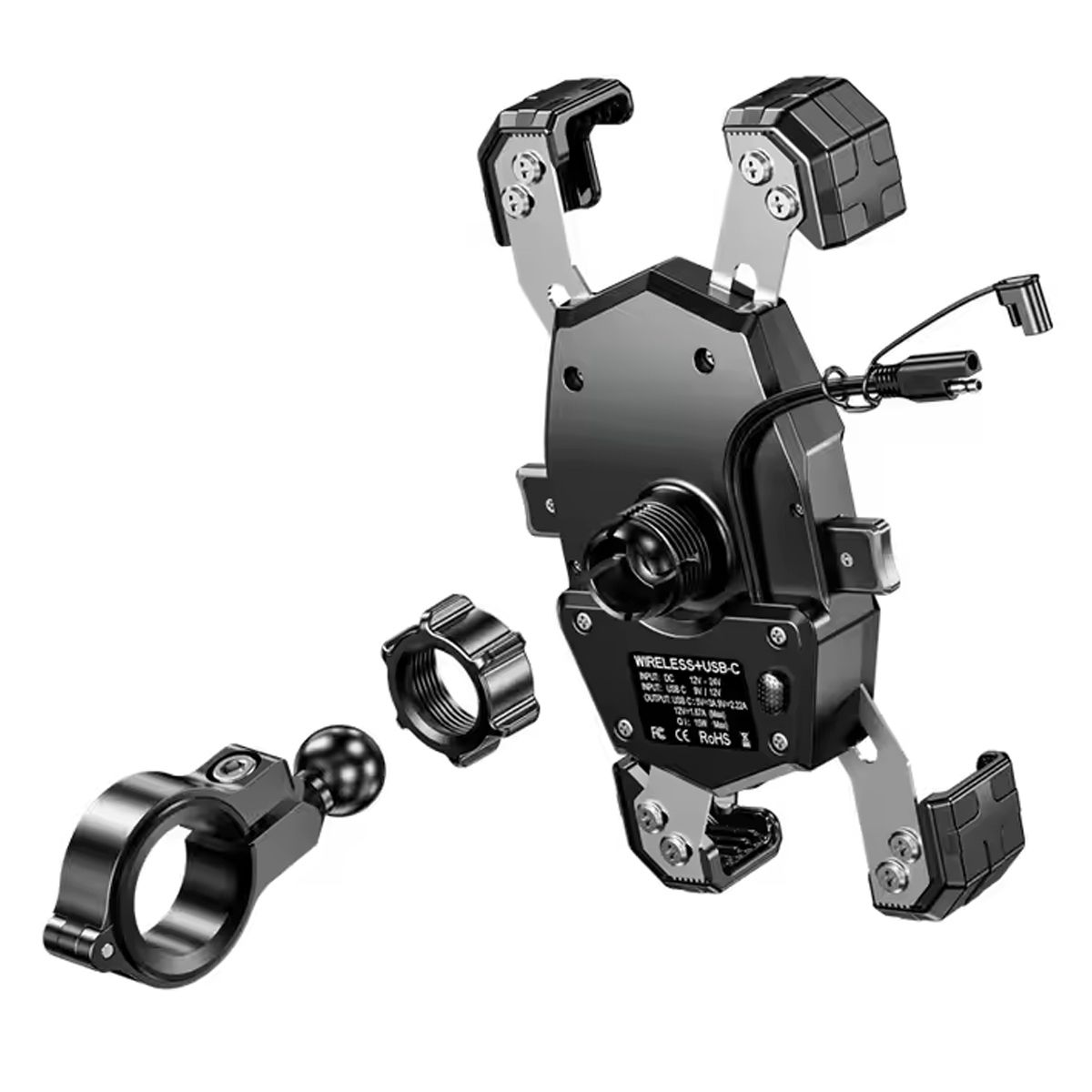 Кріплення моделі M22-A1виготовлено з високоякісного матеріалу ABS в поєднанні з алюмінієм і нержавіючої сталлю. Широкий інтервал між рукоятками і їх плавне регулювання дозволяють точно встановити тримач на телефон. Можливість установки ручки на кермі, а також під гвинтом дзеркала робить його надзвичайно універсальним і підходить для більшості мотоциклів. Просто покладіть телефон на тримач, і кріплення автоматично закриються. Для телефонів з бездротовою зарядкою процес зарядки також починається автоматично.