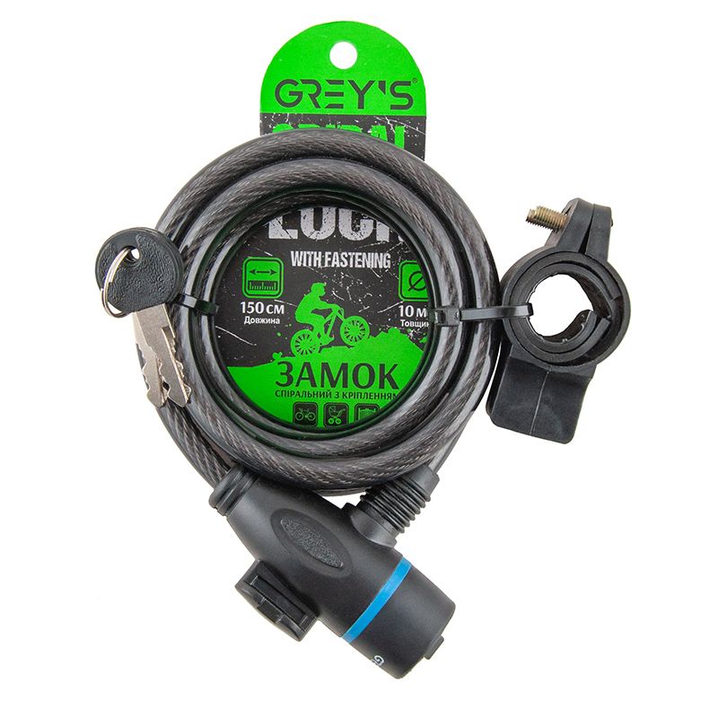 Замок спіральний з кріпленням Grey s виготовлений зі сталевого спірального троса в прогумованому корпусі.