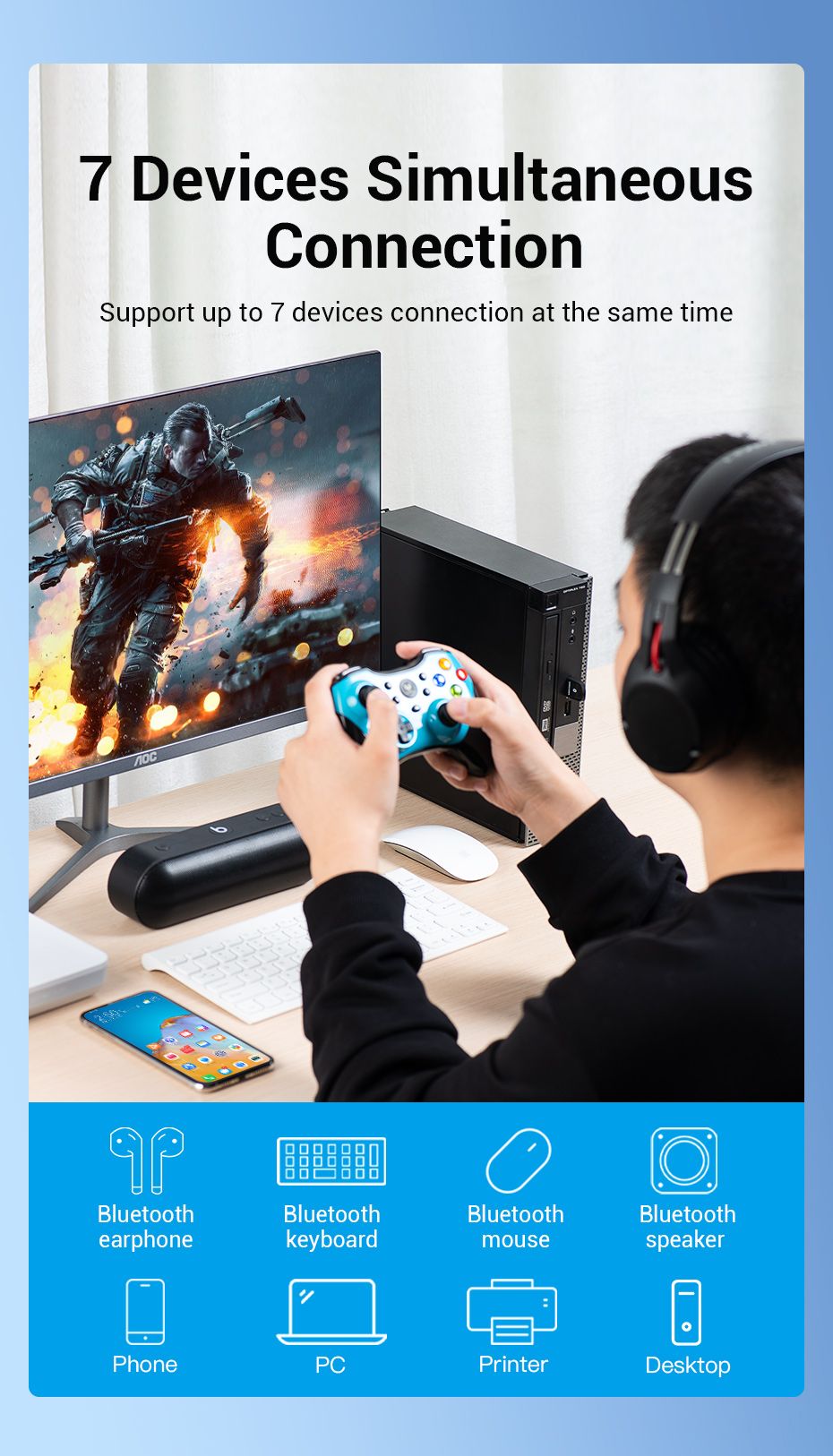 Vention USB Bluetooth 5.0 Adapter White (CDSW0) адаптер забезпечує ваш комп'ютер функцією Bluetooth, сумісний із пристроями Bluetooth 4.2/4.1/4.0, дозволяє легко передавати файли та музику.ПРИЄДНАЙТЕ 7 ПРИСТРОЇВ ДО ПКЛегко підключити 7 бездротових пристроїв до ПК через Vention Bluetooth 5.0. Підтримує одночасне підключення до ПК динаміків, Bluetooth-навушників, миші, клавіатури, телефону та принтера.МІНІ-USB АДАПТЕРНизькопрофільний компактний маленький USB-адаптер дозволяє залишити його увімкненим у вашому ноутбуці або ПК, не блокуючи або не заважаючи сусіднім USB-портам. Заощаджуйте місце за допомогою цього міні-бездротового USB-донгла для Bluetooth-принтерів, динаміків, навушників, гарнітур, клавіатур, мишей і т.д.ПРОСЛУХУВАННЯ МУЗИКИ І ПРИЙОМ ДЗВІНКІВАдаптер Vention USB Bluetooth5.0 Adapter White (CDSW0) для ПК підключається до навушників або динаміків Bluetooth для бездротової передачі стерео музики. Крім того, у вас є можливість здійснювати Skype або телефонні дзвінки з використанням мікрофона навушників та використовувати USB-адаптер для передачі файлів на мобільні телефони/планшети.ВІДМІННЕ ПОДОЛАННЯ ПЕРЕШКОДUSB-адаптер Vention Bluetooth 5.0 підтримує співіснування з Wi-Fi 2.4 ГГц без взаємних перешкод та плавну передачу між пристроями.ПІДТРИМКА СИСТЕМДрайвер не потрібний для систем вище Windows 8. Для систем Win7/XP і нижче, сумісних з Bluetooth 4.0 і нижче, слід встановити драйвер.СТАНДАРТ BLUETOOTH 5.0Оновлений чіп RTL8761B Bluetooth 5.0 забезпечує стабільну передачу сигналу. Додає функцію Bluetooth на ПК. Підключається до будь-якого порту USB для реалізації функції Bluetooth.