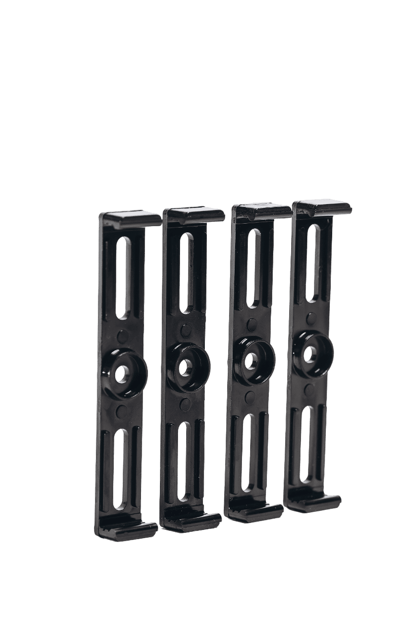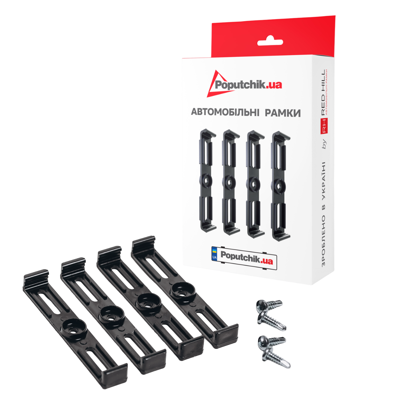 Комплект розраховано для кріплення двух номерних знаків (передній та задній). Один номерний знак кріпиться на 2 кріплення та 2 саморізів.