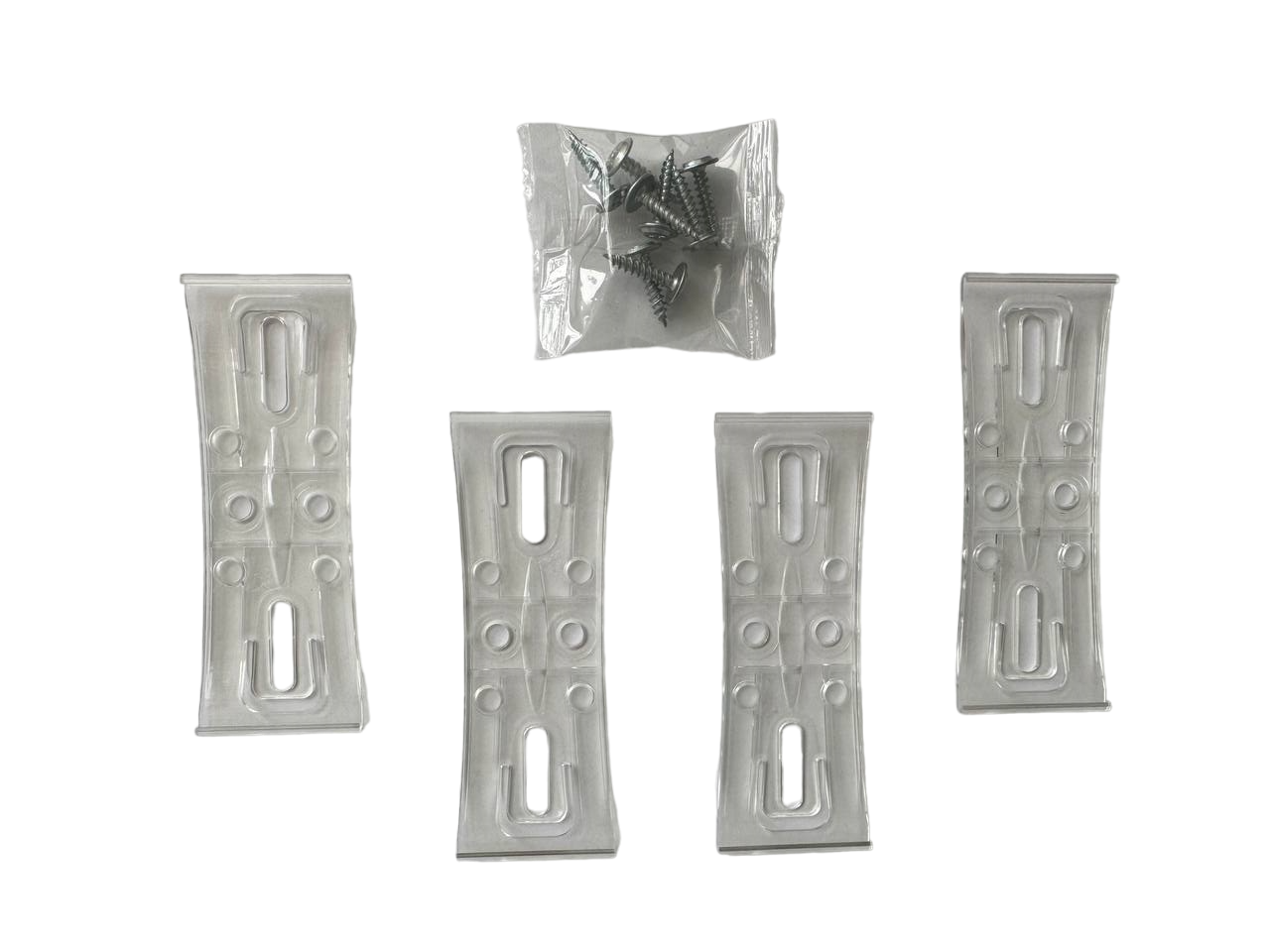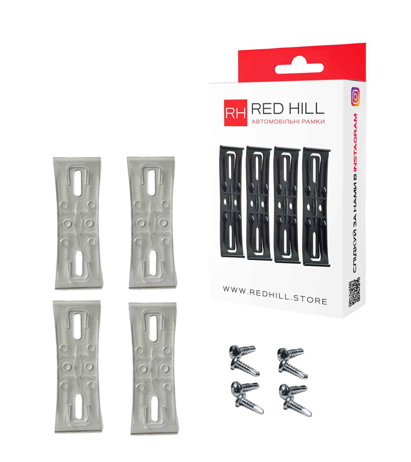 Комплект розраховано для кріплення двух номерних знаків (передній та задній). Один номерний знак кріпиться на 2 кріплення та кожне на 2 саморізи.