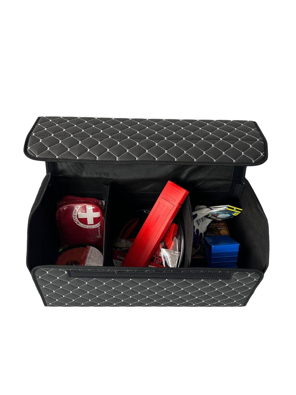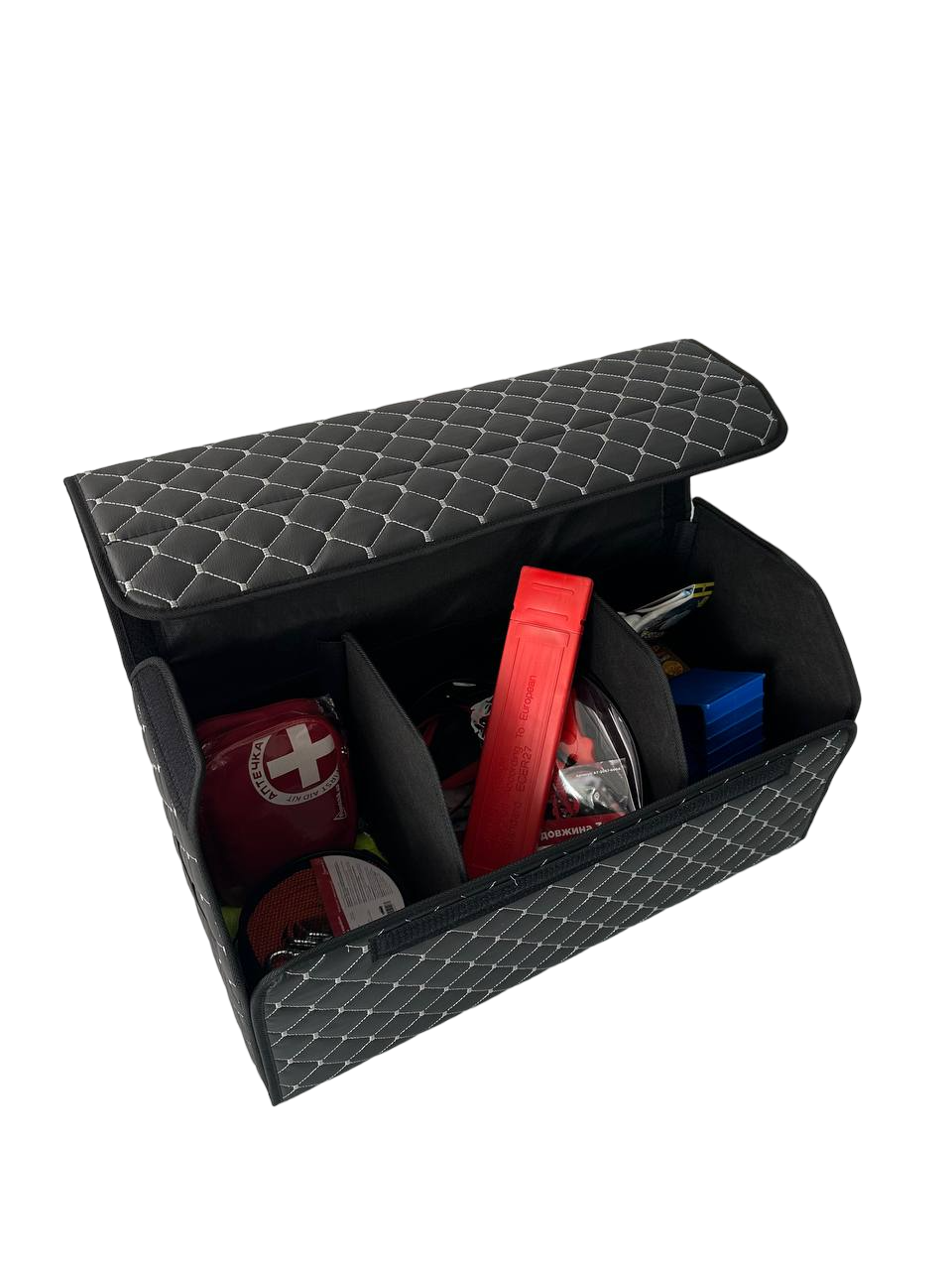 - На задній стінці має липучку для надійної фіксації в багажнику.