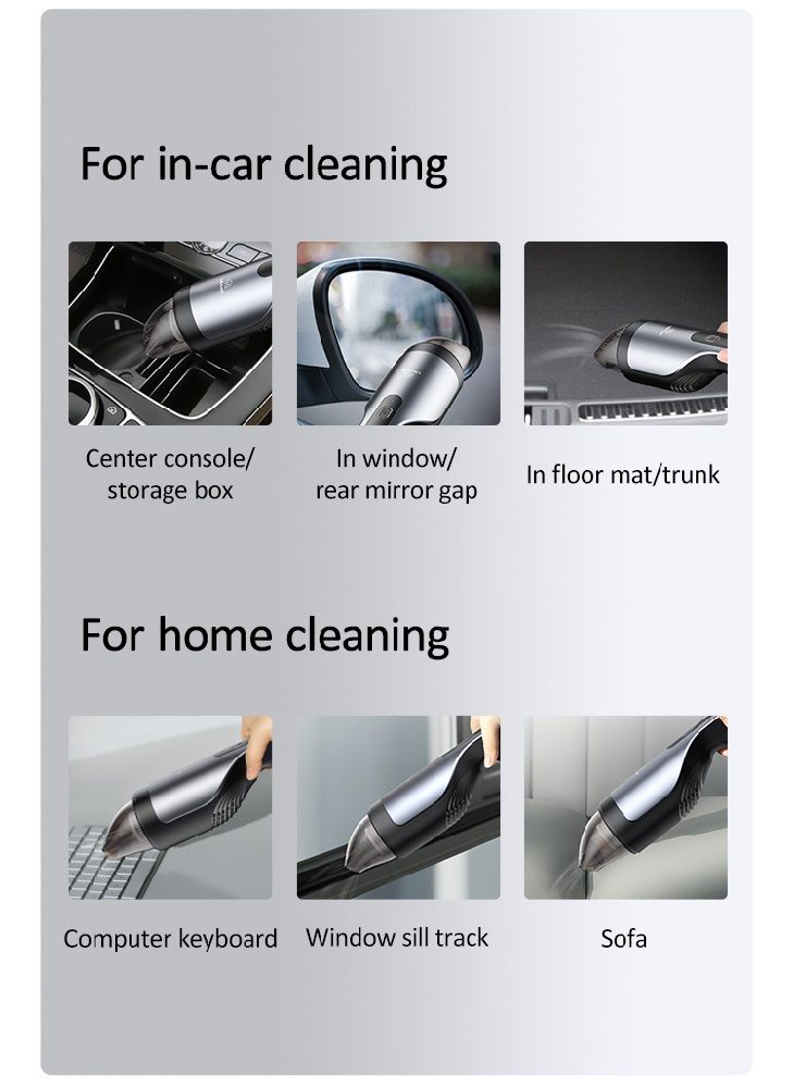 Пристрій виконаний з сучасного полікарбонату і термопластика ABS, що, в свою чергу, забезпечує надійність і довговічність пилососа. Підтримує високу потужність, завдяки чому допоможе очистити всі забруднені важкодоступні зазори автомобіля: якісно очищає дрібні елементи, пил в зазорах кнопок, кутах.