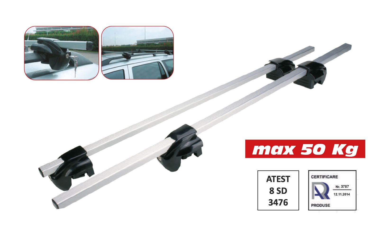 Дана багажна система, виготовлена зі сталі, монтується на будь-які стандартні рейлінги з проствітом. Вона швидко й легко кріпиться, що дозволяє за необхідності перемістити поперечини в потрібний бік, змінюючи відстань між ними. Профіль прямокутний, довжина кріплення становить 120 см. Максимальне навантаження 50 кг. Фіксується за допомогою ключа. Підходить для встановлення додаткових фіксаторів для перевезення спортивного інвентарю, вантажних боксів та інших вантажів. Багажник універсальний та сумісний з більшістю марок автомобілів.