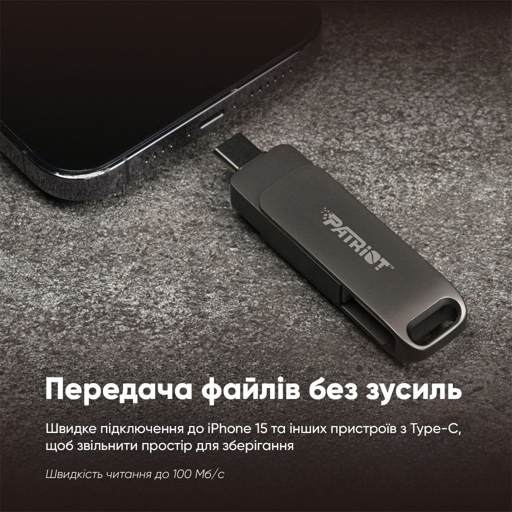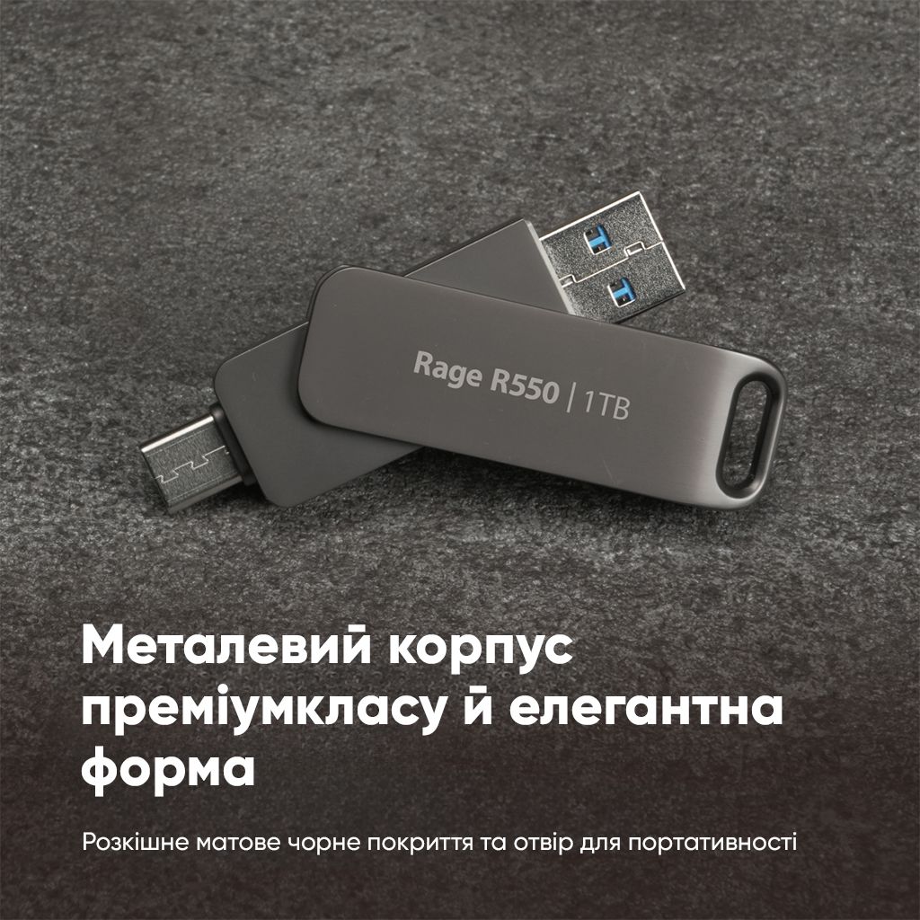 Флеш-накопичувач Patriot Rage R550 USB 3.2 — це високошвидкісний USB-накопичувач із подвійним інтерфейсом Type-A та Type-C. USB Type-C — універсальний роз’єм, який можна використовувати для кількох цілей, зокрема для передачі даних, відео й аудіо швидше, ніж зі звичайним USB. Завдяки швидкості читання до 100 МБ/с, завантаження та передача файлів відбуваються ефективніше, ніж будь-коли.Щоб зберегти файли в безпеці, USB-накопичувач має захист роз’ємів і оснащений роз'ємом для підвішування флеш-накопичувача на кільце для ключів, що забезпечує його безпеку та портативність.Rage 550 USB — це флеш-накопичувач подвійного призначення, який дозволяє легко передавати файли між смартфонами, планшетами, а також комп’ютерами.ОСОБЛИВОСТІ− Подвійний інтерфейс USB Type-A і Type-C;