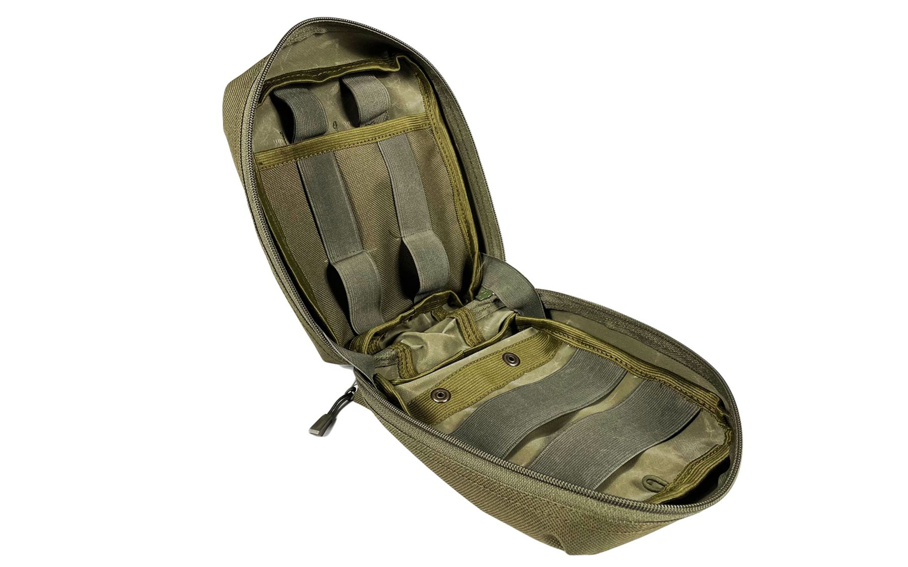 Компактна медична сумка для ліків та медичних аксесуарів з індивідуального військового набору для надання першої медичної допомоги в умовах військових навчань та активних бойових дій.