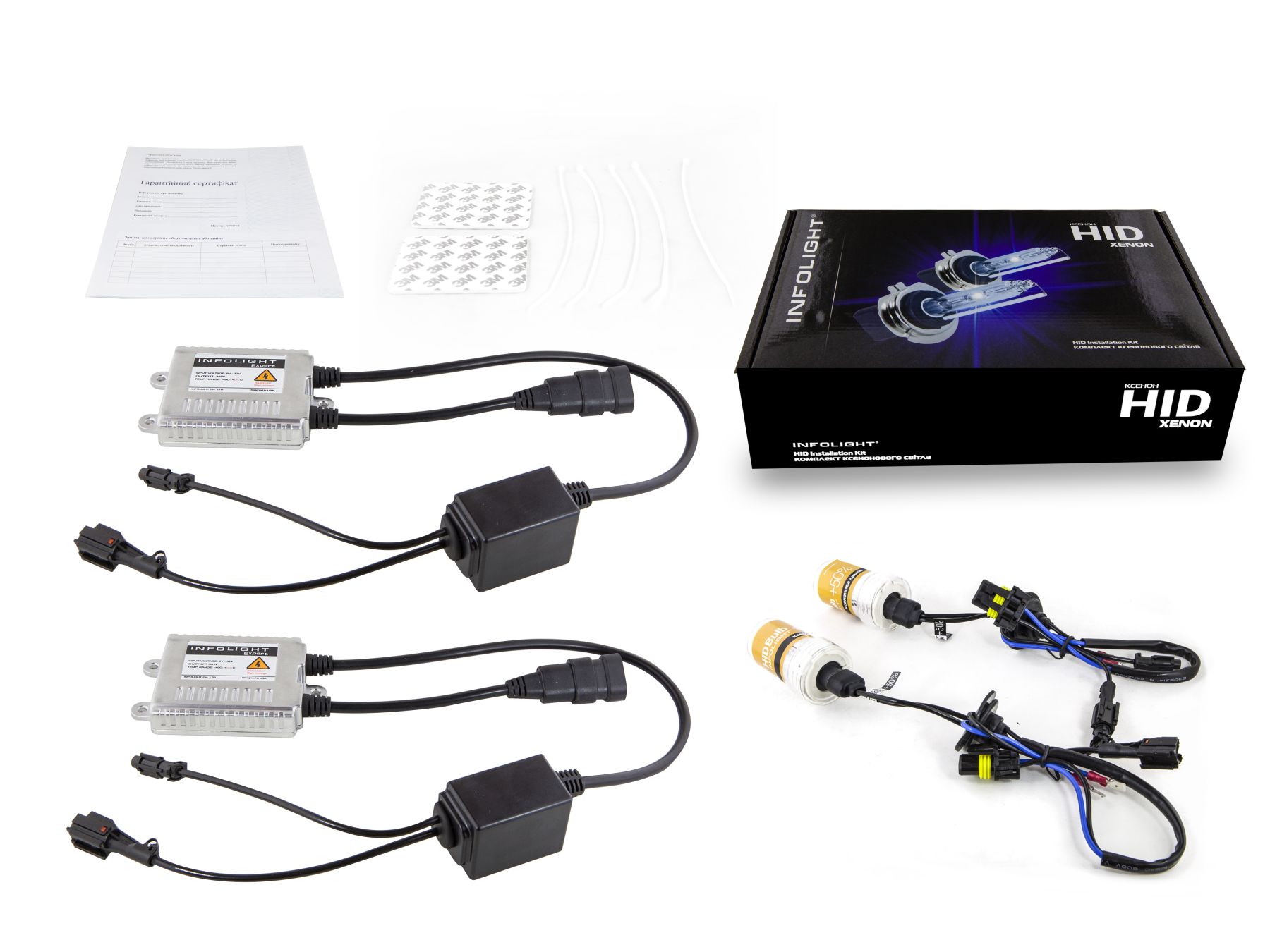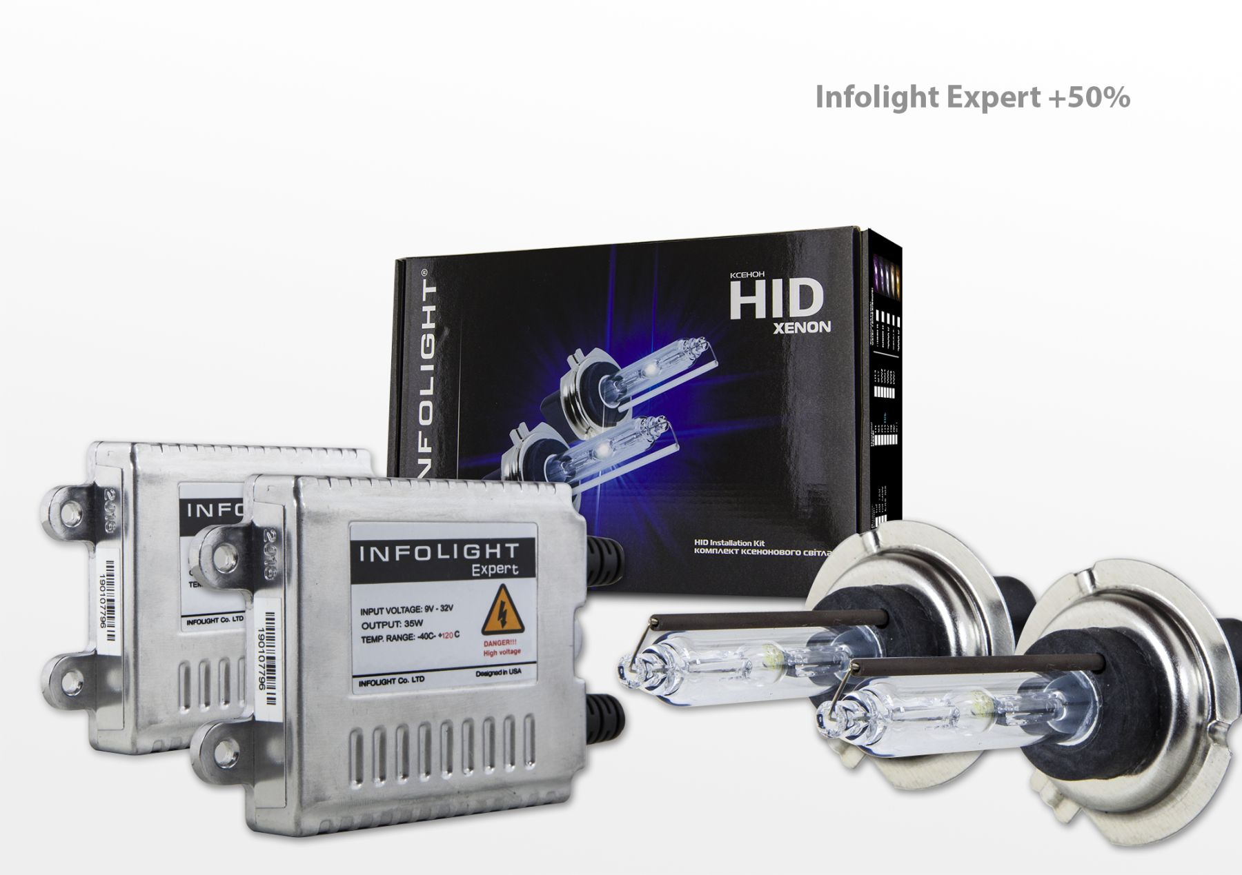 Комплекты ксенона Infolight Expert +50% устанавливаются почти на любой автомобиль, а также обладают встроенными системами блокировки при разбитии лампы и обрыве (коротком замыкании) высоковольтных проводов.