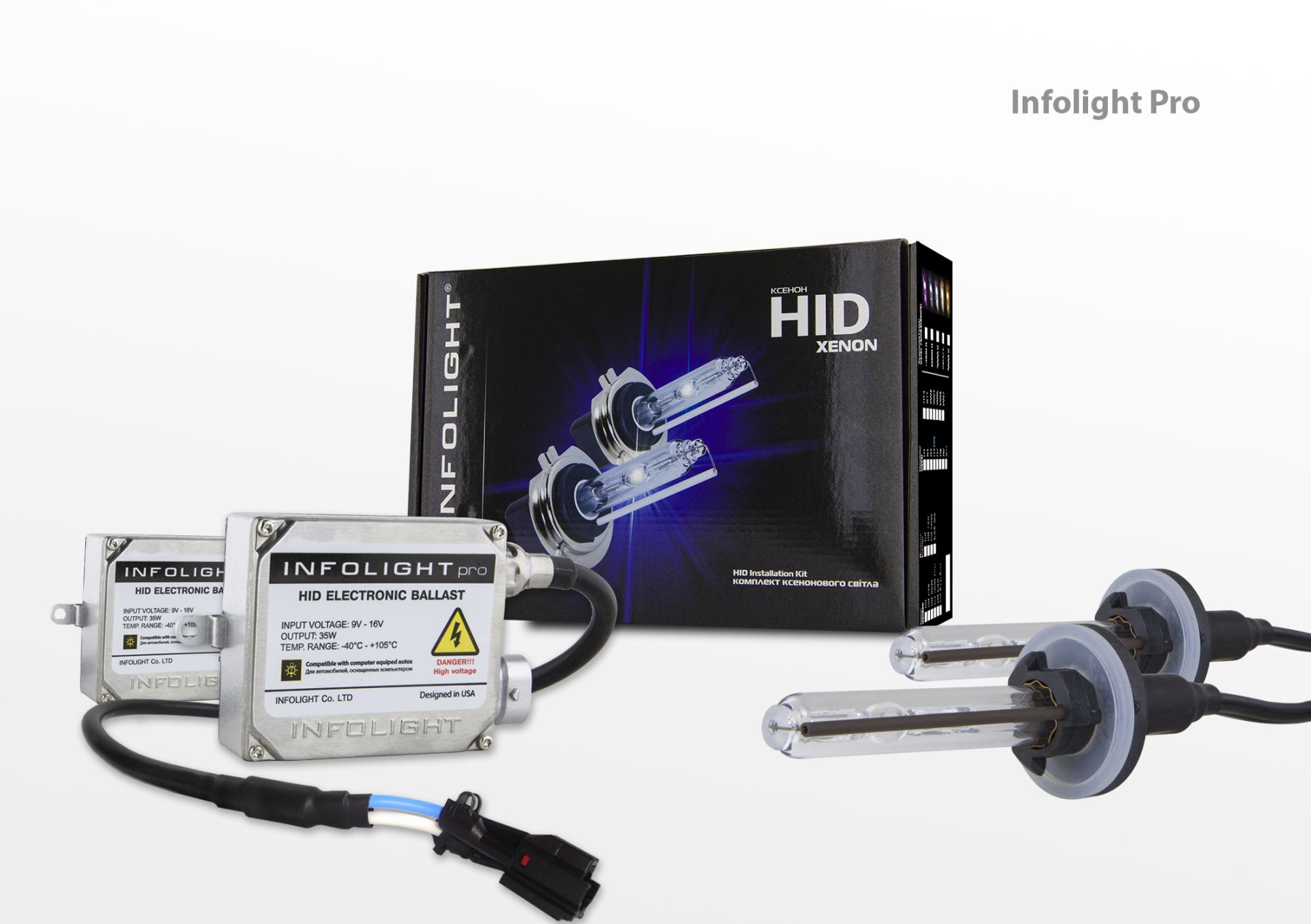 Особенностью блоков Infolight Pro является то, что они имеют встроенную обманку бортового компьютера (canbus). Обманка (canbus) - это устройство которое создает дополнительное сопротивление в цепи лампы, она необходима для того, чтобы контроллер не сообщал об ошибке, если лампочка меньшей мощности, и обеспечивает корректную работу автомобильной электроники. Они используются при замене галогеновых ламп на ксеноновые или светодиодные, когда нет возможности перепрограммировать бортовой компьютер.Комплекты ксенона Infolight устанавливаются почти на любой автомобиль, а также обладают встроенными системами блокировки при разбитии лампы и обрыве (коротком замыкании) высоковольтных проводов.