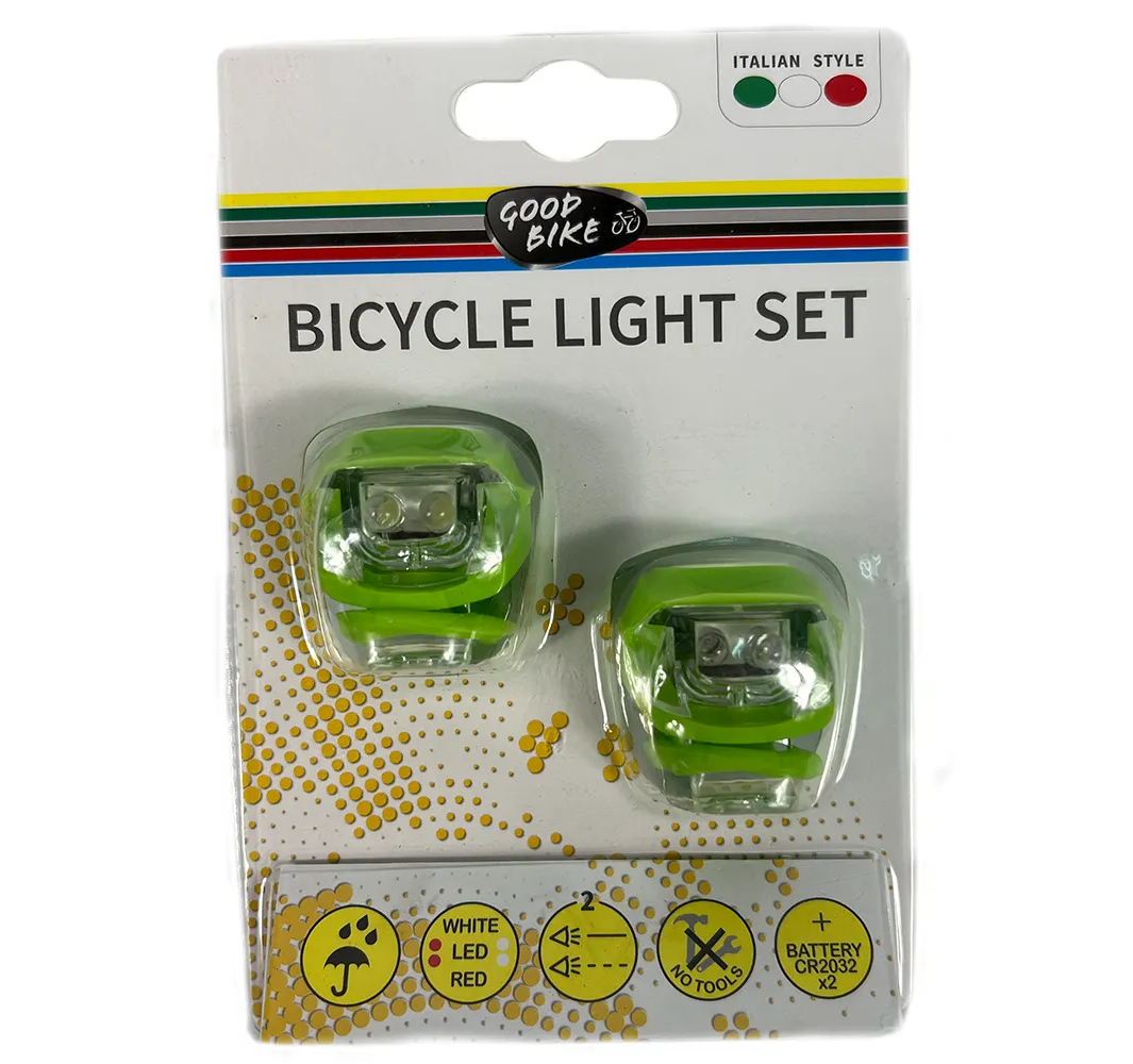 Комплект з двох ліхтарів блимавок (передні та задні) у силіконовому корпусі. Призначені для позначення велосипедиста на дорозі чи для додаткового/резервного освітлення в темний час доби.