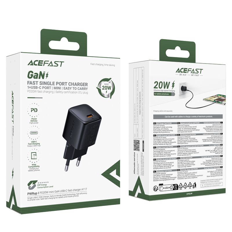 ACEFAST A117 PD20W mini GaN USB-C fast charger Black — компактний зарядний пристрій.ACEFAST A117 підтримує протоколи швидкої зарядки та потужність до 20 Вт, що забезпечує максимальну швидкість заряджання смартфонів, планшетів, смартгодинників та інших компактних електронних пристроїв.Використання транзисторів GaN дозволяє заряджати гаджети швидше і безпечніше, зробити зарядний пристрій компактнішим і захистити від перегріву.Зарядний пристрій має невеликий розмір 70.4*30.4*30.2 мм. Він легко поміститься навіть в сумочці, не займає місця при зберіганні та не заважає користуватися сусідніми розетками.Вбудований чип інтелектуального захисту розпізнає тип пристрою та автоматично регулює потужність зарядки, а також оберігає електроніку від коротких замикань, надструму, надмірної напруги, високих температур та дії електростатичних явищ.