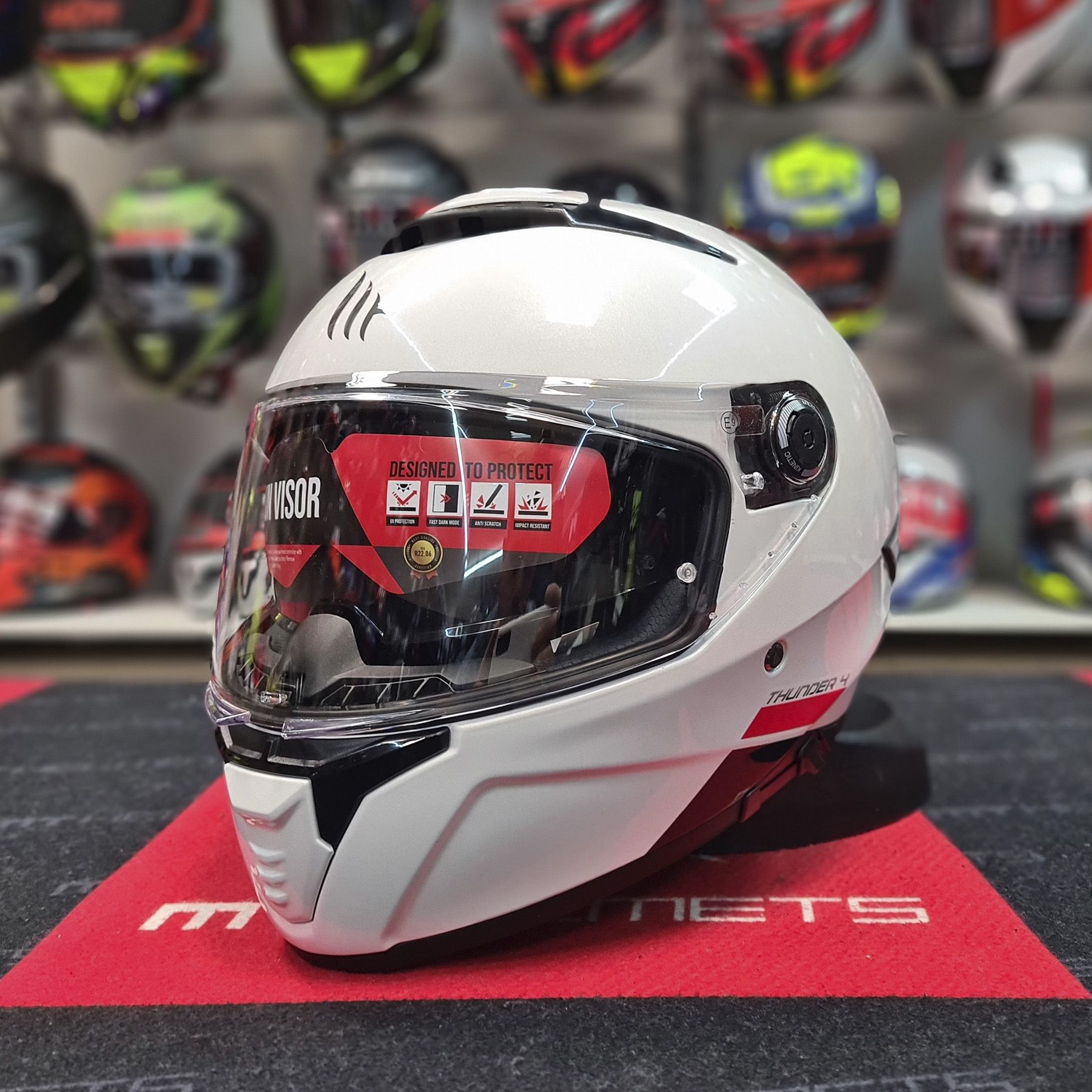 Новий бестселлер від MT Helmets з найновішим сертифікатом безпеки ECE 22.06, що враховує додаткові тести безпеки на дотичні удари, чого не було в ECE 22.05 та ще 16 додаткових тестів. Тепер тестуються всі розміри оболонки шолома, а також шолом з додатковими аксесуарами, як то гарнітура чи спойлер. Шолом має місце для встановлення заводської гарнітури MT Rider Sync MT-B01 або з кращим звучанням 4X UCS від Cardo з навушниками JBL. Ви отримуєте найсучасніший шолом, що відповідає самим жорстким умовам безпеки на планеті!