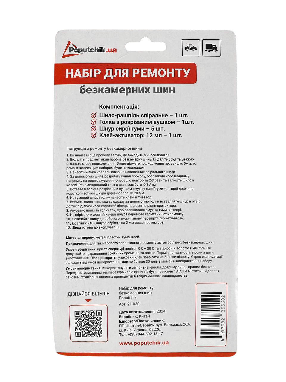 Швидкий та зручний інструмент для тимчасового ремонту безкамерних шин автомобіля.