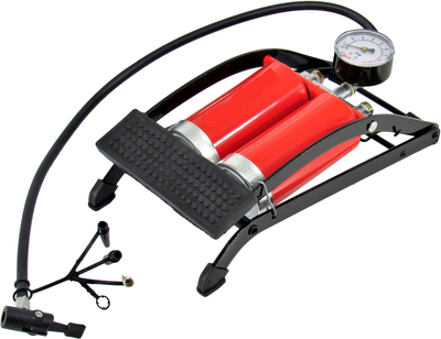 Ножний насос з двома циліндрами — це необхідний інструмент для швидкого та ефективного накачування автомобільних та велосипедних шин, гумових виробів або спортивного інвентарю, такого як футбольні м'ячі. Оснащений манометром для точного контролю тиску і додатковими адаптерами для універсального використання.