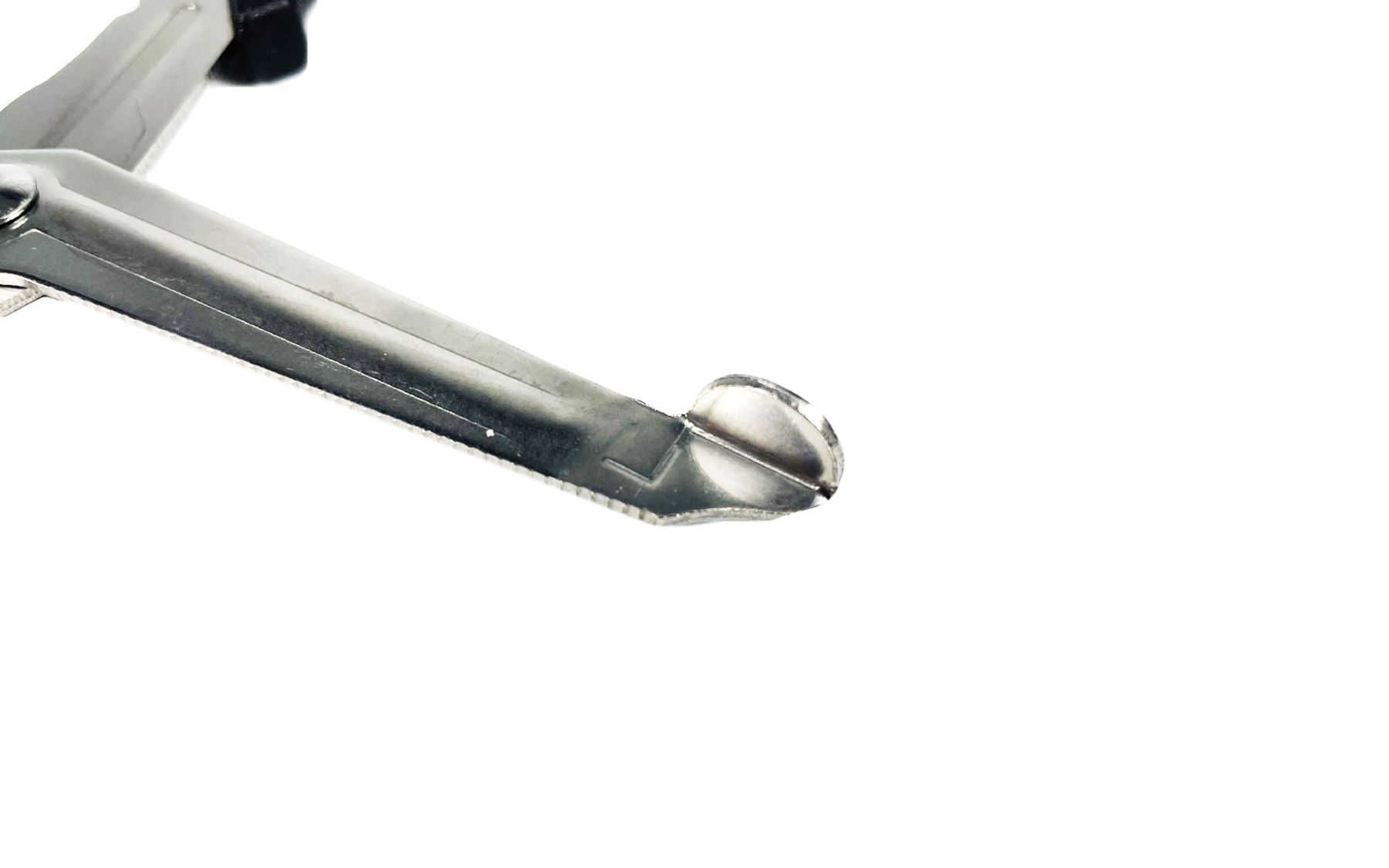 Одне з лез ножиць має зазубрене лезо для більшої ефективності різання міцних тканин.