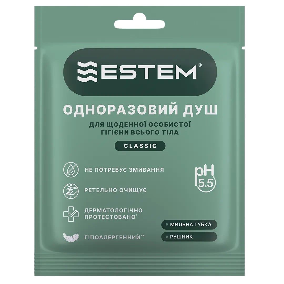 Одноразовий душ Estem Classic ідеально підходить для забезпечення особистої гігієни в умовах, коли доступ до води обмежений. Кожен комплект включає мильну губку та рушник, що забезпечують швидке та ефективне очищення шкіри у будь-яких ситуаціях.