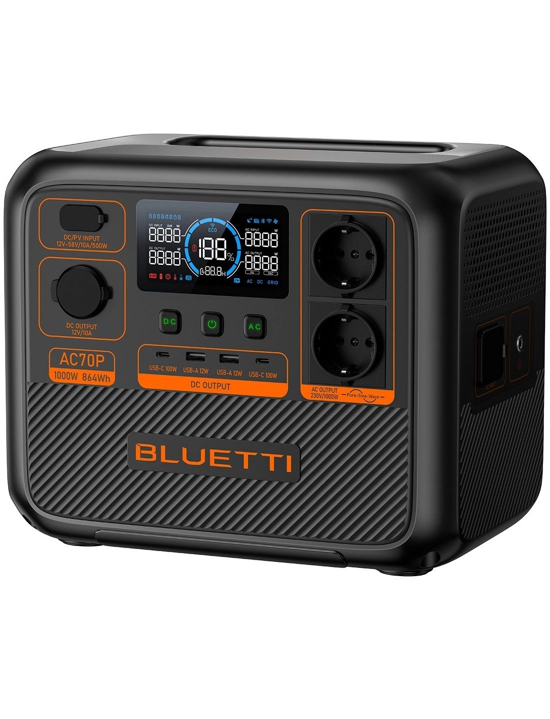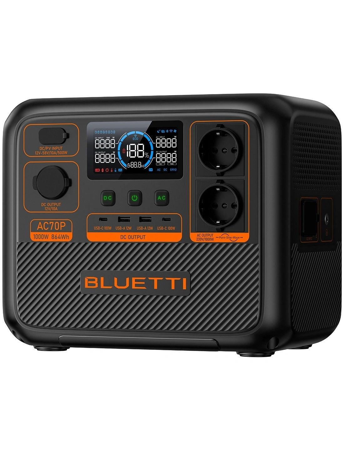 BLUETTI AC70P – це потужна та надійна портативна електростанція з номінальною потужністю 1000 Вт (пікова – 2000 Вт), яка забезпечить стабільне живлення у будь-якій ситуації – від кемпінгу до аварійного використання вдома.
