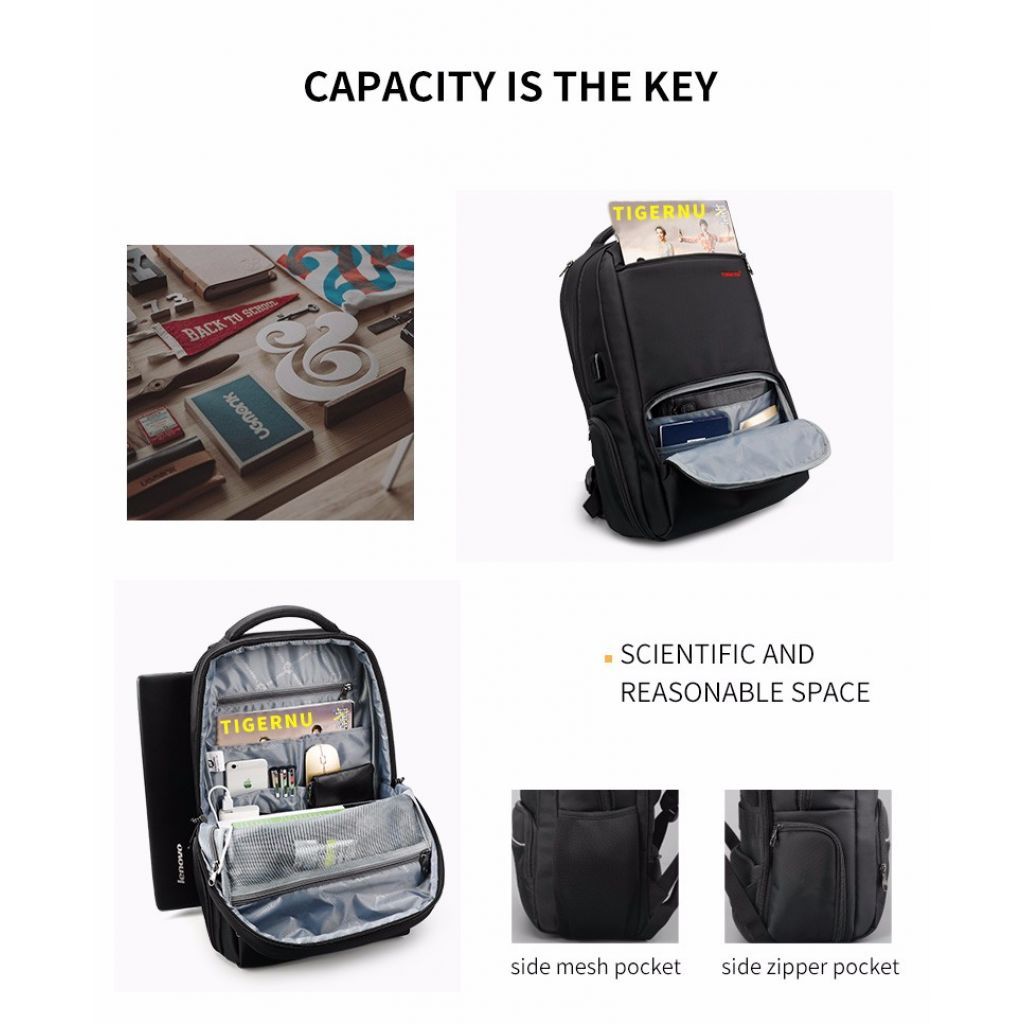 Міський рюкзак для ноутбука Tigernu T-B3319 — нова модель бренду Tigernu. Рюкзак місткий і функціональний. Маючи класичний дизайн прекрасно підійде старшокласникам, студентам або діловим людям.Основний матеріал — міцна і водонепроникним тканина Нейлон 70х200.Рюкзак оснащений міцною пластиковою фурнітурою: фастекси, рамки, фіксатори, карабіни та інше виготовлені з Поліацеталю (POM). Даний матеріал володіє низьким коефіцієнтом тертя, має високу міцність, стійкість до ударних навантажень, в тому числі при низьких температурах.Ближче до спини розташований м'який, повністю захищений від ударів відділ для ноутбука 15.6 дюймів. Для полегшення завантаження, вхід в відділ для ноутбука розташований збоку рюкзака.На спинці рюкзака знаходиться потайна кишеня на блискавці, яка призначена для зберігання гаманця або документів, а також стрічка, за яку рюкзак можна повісити на висувну ручку валізи.Велике основне відділення, закривається на унікальну, запатентовану подвійну блискавку. Основне відділення призначене для зберігання особистих речей, документів формату A4 і має всередині безліч додаткових відсіків, відділ для планшета або нетбука, внутрішню кишеню-органайзер для дрібних предметів, канцтоварів, мобільного телефону.У верхній частині передньої стінки рюкзака розміщена плоска кишеня на блискавці, в якої є знімний карабін для ключів і безліч кишень для канцтоварів та інших дрібниць.У нижній частині передньої стінки знаходиться об'ємна кишеня в якій також багато дрібних відділень. Зовні кишені є світловідбиваюча смуга.З боків рюкзака знаходяться одна об'ємна кишеня на блискавці і одна сітчаста для перенесення пляшок з водою.Комфортна м'яка ручка для перенесення в руці, за яку рюкзак можна повісити на гачок.Зручна м'яка вентильована спинка захищає спину від ударів.Ергономічні анатомічні лямки, що повторюють форму плеча, дозволяють правильно розподілити навантаження і роблять рюкзак зручним в експлуатації. Лямки оснащені грудною стяжкою, регульованою по висоті і об'єму грудей.