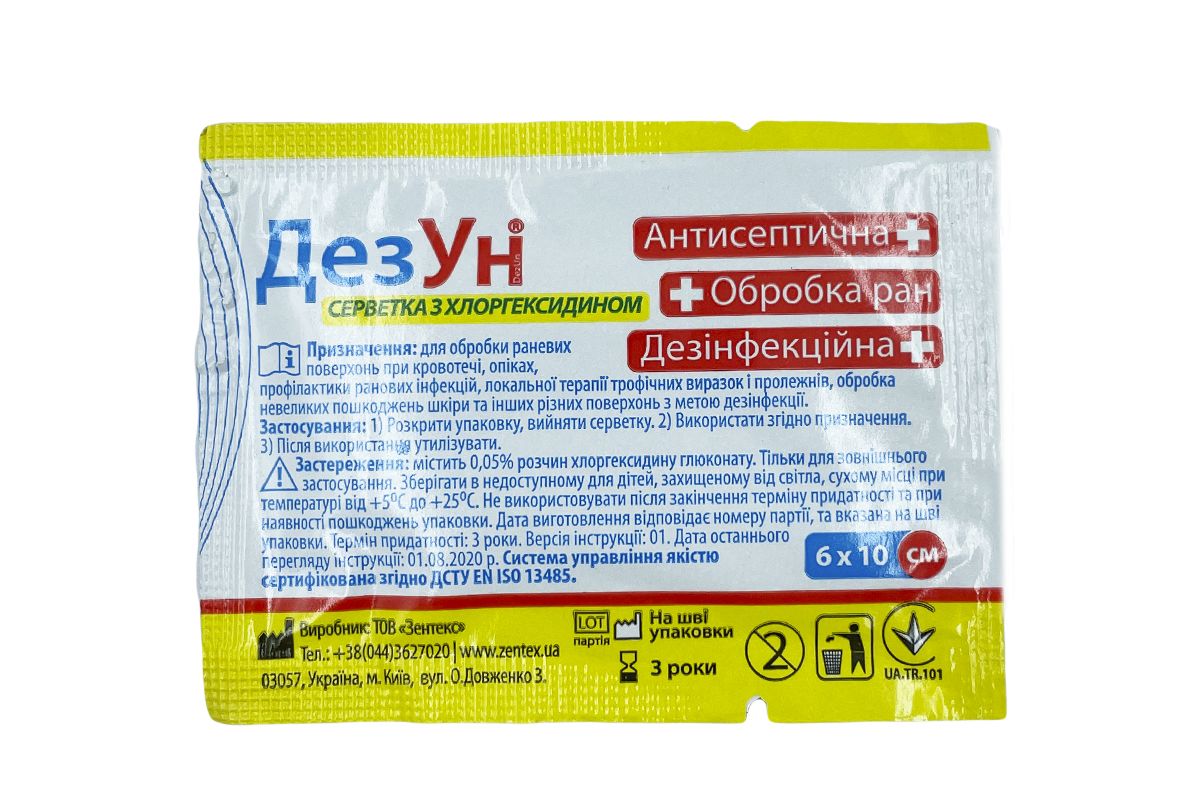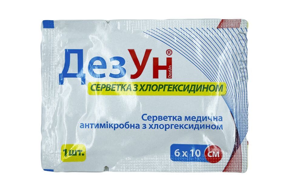 Медична серветка з нетканого матеріалу, просочена розчином глюконату хлоргексидину, герметично упакована в індивідуальний пакетик.