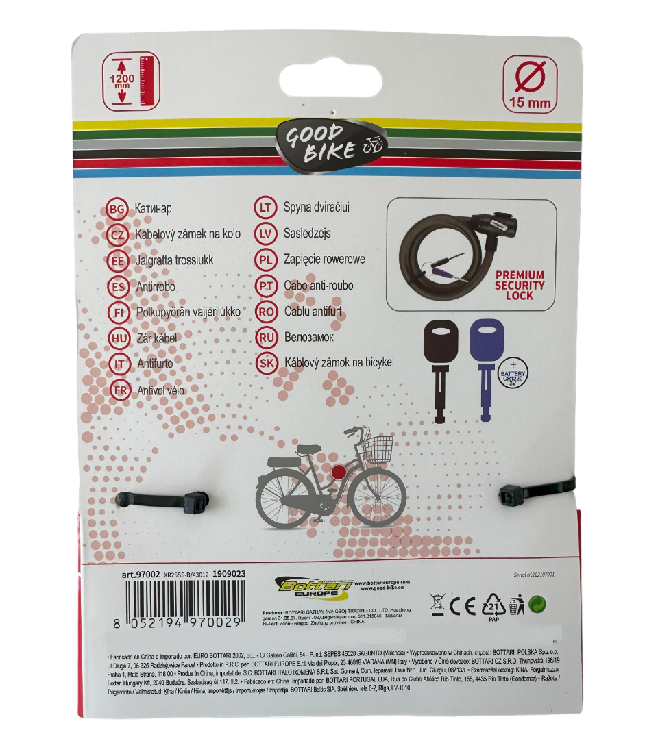 Велозамок тросовий Ø15 x 1200мм 2 ключа, 1 ключ - ліхтар "PREMIUM SECURITY"