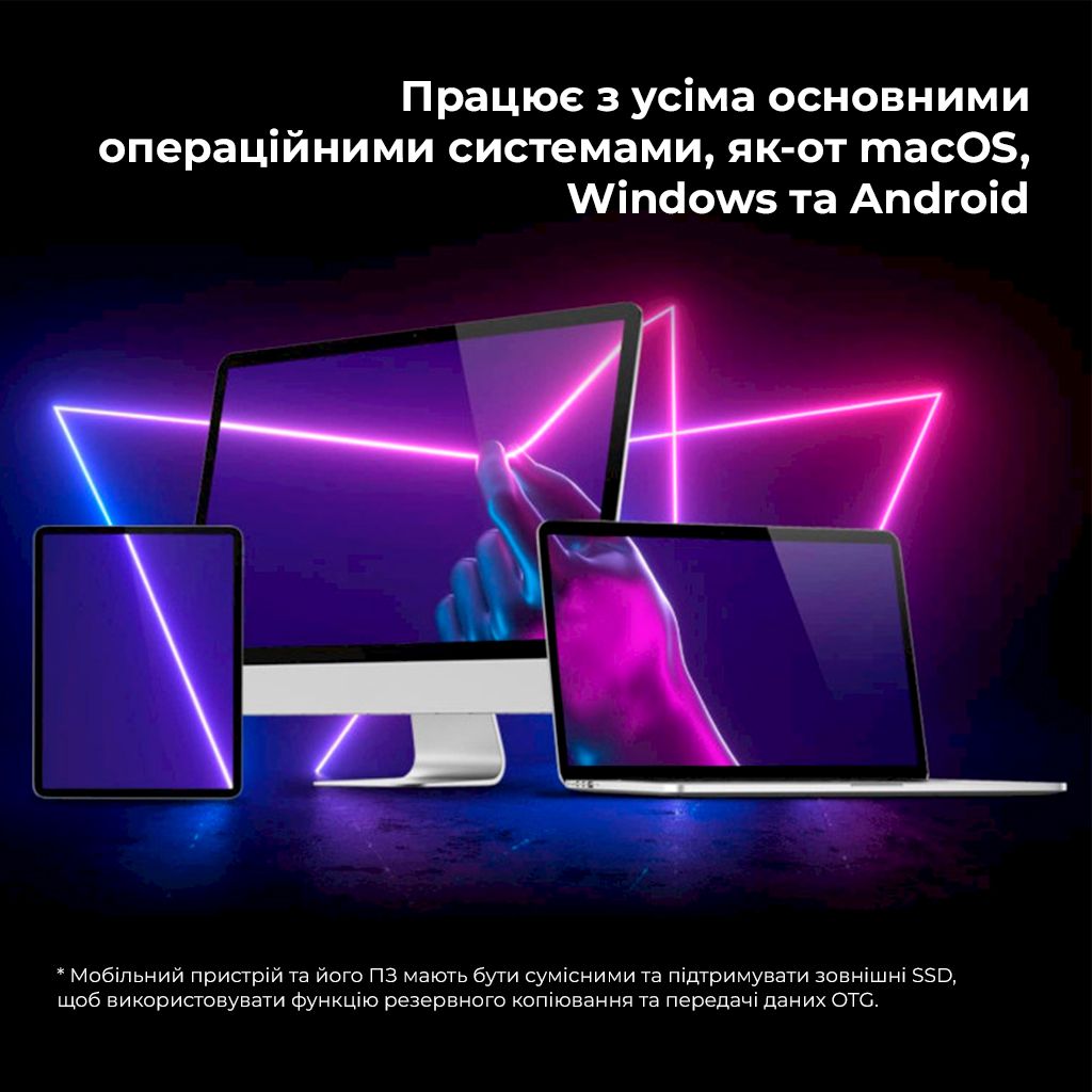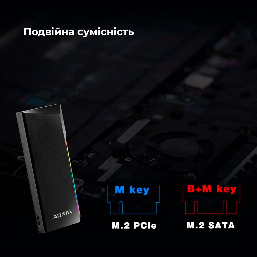 Корпус ADATA EC700G дасть змогу старому внутрішньому твердотільному накопичувачу M.2 PCIe або SATA отримати нове життя як зовнішньому SSD. EC700G підтримує інтерфейс USB 3.2 Gen2 з портом Type-C, що забезпечує швидкість передавання даних до 10 Гбіт/с.ЯСКРАВИЙ І КРАСИВИЙСліпуче RGB-підсвічування й елегантні геометричні форми роблять EC700G пристроєм зі стриманим стилем.СУМІСНІСТЬ ІЗ ТВЕРДОТІЛЬНИМИ НАКОПИЧУВАЧАМИ PCIE І SATAНезалежно від того, чи є у вас твердотільний накопичувач M.2 PCIe або SATA, EC700G сумісний з усіма ними.ПІДТРИМУЮТЬСЯ РІЗНІ РОЗМІРИ M.2EC700G працює не тільки з найпоширенішими розмірами M.2 2280, а й з M.2 2242 і M.2 2230.ШВИДКІСТЬ USB 3.2 GEN2Завдяки підтримці USB 3.2 Gen2 і Type-C EC700G може розвивати швидкість до 1000 МБ/с, що приблизно в 12.5 разів швидше, ніж у звичайних зовнішніх жорстких дисків. Це означає, що передача фільму розміром 10 ГБ займе всього 20 секунд.ВСТАНОВЛЕННЯ БЕЗ ІНСТРУМЕНТІВВстановлення просте як 1, 2, 3. Ніякі викрутки не потрібні. Просто використовуйте свої руки.ВИКОРИСТАННЯ В РІЗНИХ ОПЕРАЦІЙНИХ СИСТЕМАХEC700G працює з усіма основними операційними системами, включно з macOS, Windows і Android. Переносьте фільми, музику, фотографії та багато іншого на різні пристрої швидко і легко.